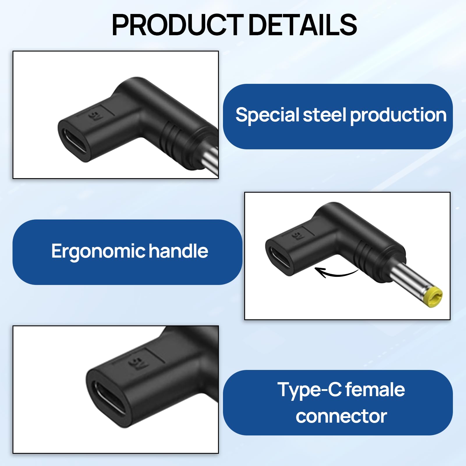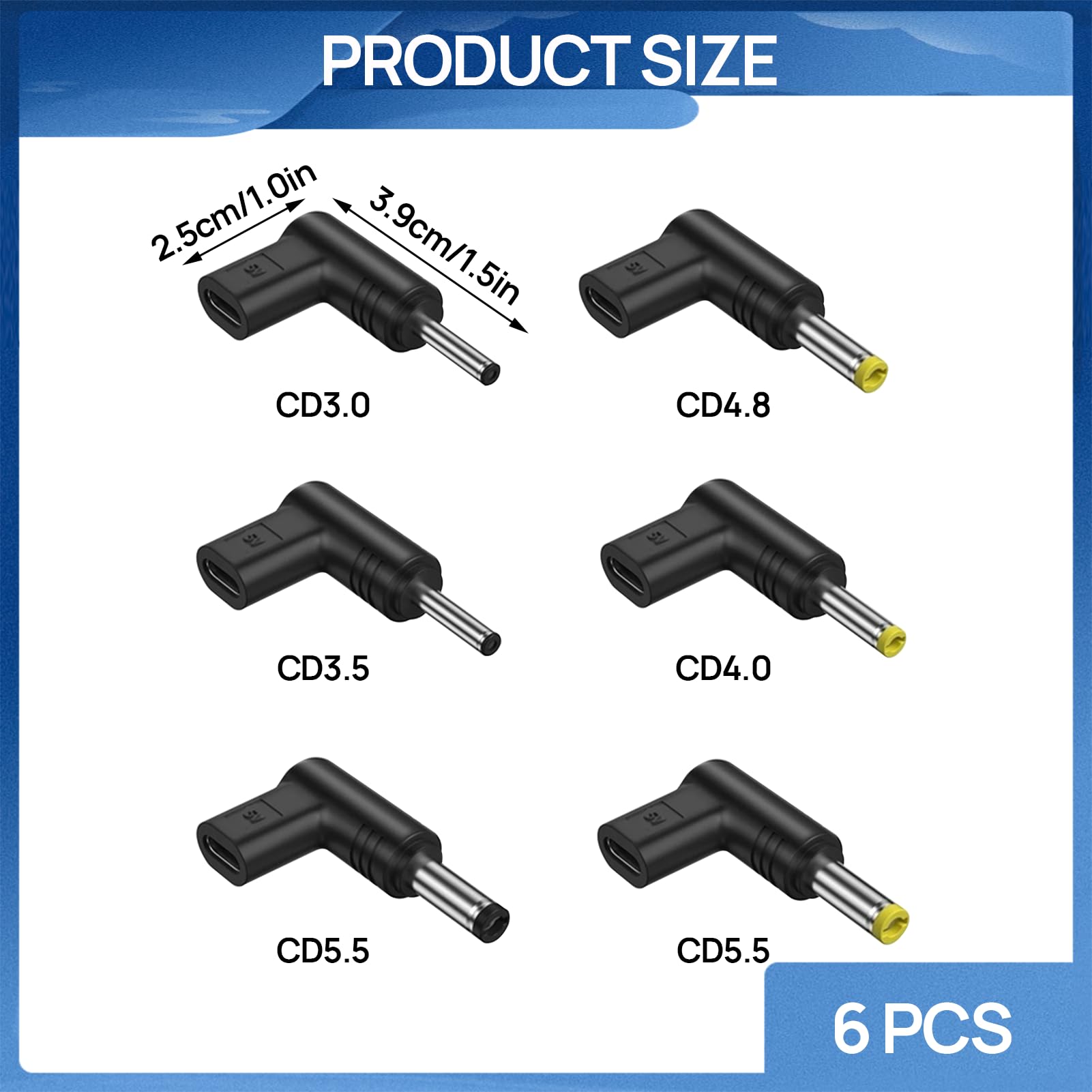 Supporte jusqu'à 12V/3A - parfait pour alimenter différents appareils DC. YAODHAOD 6PCS USB C vers DC Adaptateur 90 ° inclinable DC 5V 9V 12V 15V PD simulateur déclencheur de Charge Plug pour Ordinateur Portable, routeur, Prise de Chargeur d'alimentation Mobile (15V Descriptions des produits -L'adaptateur n'a pas pour fonction de modifier la tension. Comprend 4 adaptateurs pour une utilisation flexible Ne nécessite qu'un chargeur USB-C-PD compatible et un câble C vers C. Préserve les câbles et les connecteurs en réduisant la charge mécanique 🔌 Ultra-portable - Se glisse dans n'importe quelle poche ou tiroir. Optez pour un câble adaptateur USB vers prise DC. Cet accessoire pratique vous permet de connecter votre appareil à une source d'alimentation USB, que ce soit un ordinateur, un chargeur mural ou une batterie externe -Il est nécessaire d'utiliser un chargeur qui prend en charge le protocole PD. X2 convertisseur – Trouvez le meilleur prix Adaptateur 5.5x2.1mm Angle 90 Adaptateur USB C Vers DC 6 X 90 ° Angle USB C Vers DC 5V Chargeur PD Simulateur Déclencheur Adaptateur De Charge Plug Pour Ordinateur Portable Adaptateur Usb Vers Prise Dc 🔌 Design à 90° peu encombrant - Le design coudé permet un accès facile même dans les espaces restreints. La tension et l'intensité de sortie du bloc d'alimentation doivent être égales ou supérieures à la tension et à l'intensité de votre appareil. -Largement compatible avec les routeurs, les chats en fibre optique, les appareils de surveillance, les têtes de caméra, les appareils photo, les tablettes, l'alimentation mobile, les lampes de bureau, les chaînes stéréo, les appareils MP3, les petits ventilateurs, les tournevis électriques et de nombreux autres types de petits appareils électriques. Remarque : utilisez uniquement un chargeur de port C, si le chargeur de type C supporte 5 V/9 V/15 V mais pas 12 V, le convertisseur émettra la tension inférieure la plus proche de 9 V afin de protéger l'appareil. Idéal pour les routeurs, imprimantes, caméras de surveillance et autres appareils dotés d'une connexion DC 5., 5×2., 1mm
