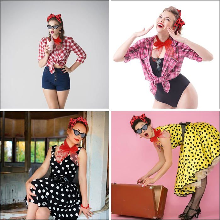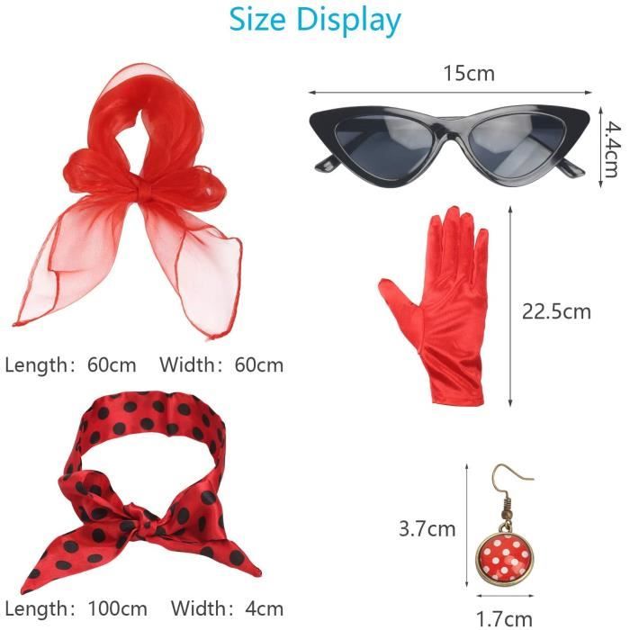 Un excellent ensemble pour tous vos besoins vestimentaires, qu'il s'agisse d'une fête vintage ou d'une tenue de tous les jours. 【Années 50 Costume Accessoires】Notre ensemble comprend 5 pcs ornements: un écharpe, une paire de gants, un paire de boucle d'oreille, un bandeau, un paire de lunettes de chat. 【Style Rétro des Années 50】Remplies d'éléments classiques à pois, ces robes rock pour femmes sont élégantes, rétro et élégantes, vous ajoutant plus de charme et d'éclat, vous faisant briller dans la foule. Accessoires des années 50 des années 1950 - Canada 【Haute qualité】Les gants sont fabriqués dans un tissu de haute qualité, doux et lisse, facile à porter ; Les foulards en soie sont légers et doux comme des plumes, doux pour la peau et respirants, confortables à porter ; Les lunettes sont en plastique, durables et durable Ensemble complet : notre bandeau à pois est la clé pour obtenir un look parfait avec plus d’options ; Associez-le à des lunettes, une écharpe, des boucles d’oreilles ou un mélange de vêtements des années 1950 pour montrer votre style unique et intensifier votre jeu de fête Robe Guinguette LOPOTIN Années 50 Costume Accessoires, Années 50 Femmes Costume 5 Pcs Ensemble à Pois Écharpe Gant Boucle Oreille Bandeau Pour Soirée De Déguisement Fête Party Carnaval (Rouge Robe Rockabilly Femme Bandeau Pour Cheveux Des Années 50 - Rouge Et Blanc | Ruban De Cheveux...