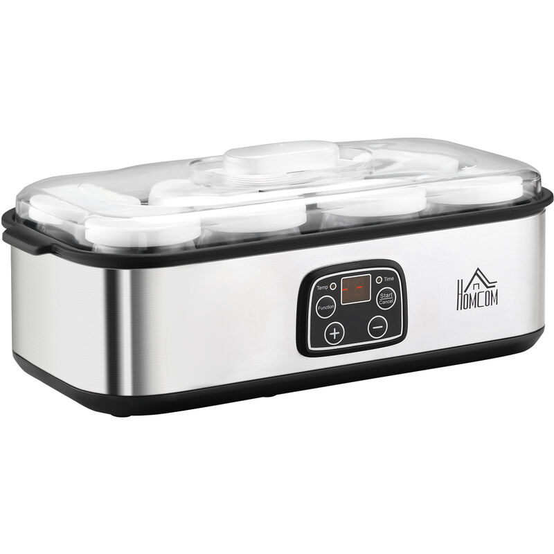 Caractéristiques Techniques Matériaux : Acier inoxydable, Polypropylène (PP), Verre , Puissance : 25 W Des Résultats Parfaits, À Chaque Fois Chaleur à 360° - Chauffage doux et homogène dans chaque pot pour un yaourt soyeux et sans grumeaux. Yaourt Maison Personnalisé: Réalisez facilement un yaourt frais et sain en seulement 3 étapes ! Construction Durable, Design Élégant Fabriquée en acier inoxydable et polypropylène résistant à la chaleur pour des années de performance. Description du produit Yaourt Frais et Sain - À Votre Façon, Chaque Jour Imaginez vous réveiller avec de petits pots de yaourt maison, lisse et onctueux - acidulé ou doux, fruité ou nature, exactement comme vous l’aimez. Pratiques, lavables au lave-vaisselle et parfaits à emporter. Inclus : 1 Yaourtière, 12 pots en verre avec couvercles, 1 guide d’utilisation Astuce : ajoutez 500 ml d’eau tiède pour un résultat optimal. Jusqu’à 12 Saveurs en Une Seule Fournée Préparez jusqu’à 12 pots (180 ml chacun) en un seul cycle - du yaourt nature classique aux mélanges fruités. Comprend 12 pots en verre réutilisables de 180 ml avec couvercles — parfaits pour des portions individuelles ou familiales. Pot Yaourt Acier Inox 25w 8 Pots Verre 180ml - Acier Inoxydable, Minuterie Numérique - Pour Yaourts Maison Sains Yaourtière Homcom Yaourtiere Seb Yaourtière en acier inoxydable avec écran LCD, réglages personnalisables et 12 pots sans BPA pour yaourts maison sains Technologie de Chauffage Constant: La chauffe à 360° assure une température uniforme pour une fermentation parfaite. 12 Pots n Vrr Sans BPA: Préparz jusqu’à 12 yaourts différnts à la fois, du styl grc crémux aux mélangs fruités ! Comprnd 12 pots n vrr réutilisabls d 180 ml avc couvrcls - parfaits pour ds portions individulls ou familials Yaourt Maison en 3 Étapes Simples 1., Mélanger & Préparer - Combinez du lait frais avec votre ferment préféré., 2., Remplir & Fermer - Versez dans les pots en verre, fermez avec les couvercles et placez-les dans la machine., 3., Régler & Déguster - Sélectionnez le temps et la température, puis laissez la machine transformer vos ingrédients en un yaourt onctueux, prêt à refroidir, servir et savourer. Réglez librement le temps (1 à 48 h) et la température (25 à 50 °C) pour ajuster l’acidité, la texture et les saveurs selon vos envies. Design compact et élégant qui s’intègre parfaitement à toutes les cuisines. Machine À Yaourt À Usage Domestique, Machine À Yaourt Bricolage De 1 Pots en verre lavables au lave-vaisselle, avec couvercles réutilisables. Personnalisable Selon Vos Goûts - Réglez le temps (1 à 48 h) et la température (25 à 50°C) pour ajuster la fermeté, l’acidité et l’onctuosité à votre convenance. Idéal pour débutants et passionnés. La yaourtière Todeco transforme le lait frais en un délicieux yaourt riche en probiotiques, sans conservateurs ni additifs.