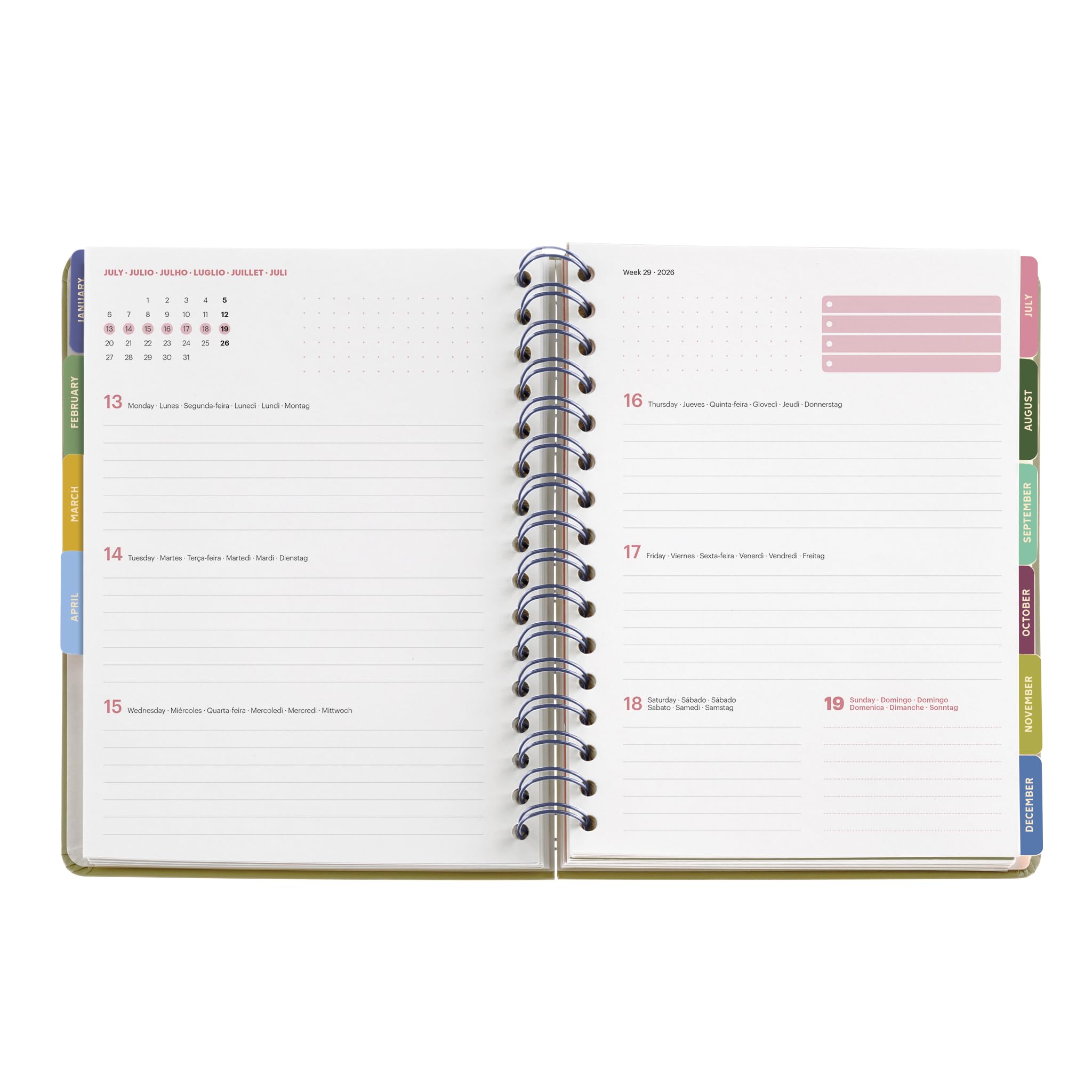 Miquelrius Agenda Escolar 25 26, Septiembre 2025 a Agosto 2026, Tamaño Agenda Fermeture élastique Miquelrius Agenda Semainier 2026, Format A5+ (160 X 218 Mm), Planification Hebdomadaire, Double Spirale, Couverture Cartonnée, Papier 100 G/m², 6 Langues, Autocollants, Design Entredos, Jardin Calendrier Journalier 2026 Contenu multilingue sur papier écologique de 100 g/m², idéal pour écrire avec un stylo ou un stylo sans traces. Organisation visuelle hebdomadaire pour toute la semaine. Organisez votre année avec des outils clés. Achetez Miquelrius Agenda semainier 2026, similaire A5 (160,5 x 218 mm), planification hebdomadaire, couverture texturée, papier 100 g/m², fermeture élastique, spirale métallique divisée, espagnol EN-PT Comprend un planning annuel et mensuel, un calendrier bisannuel, des feuilles de notes et une structure claire pour chaque période. DESIGN MINIMALISTE POUR S’ORGANISER AVEC STYLE : La collection Back to Basics allie originalité et fonctionnalité avec une couverture en carton doublée de papier imprimé texturé avec pelliculage mat, lui conférant une finition résistante et élégante Langue : espagnol, anglais, portugais. Le format semainier avec un design horizontal sur double page permet de planifier et d'anticiper vos journées avec clarté, ordre et style, idéal pour garder une vue complète de la semaine.