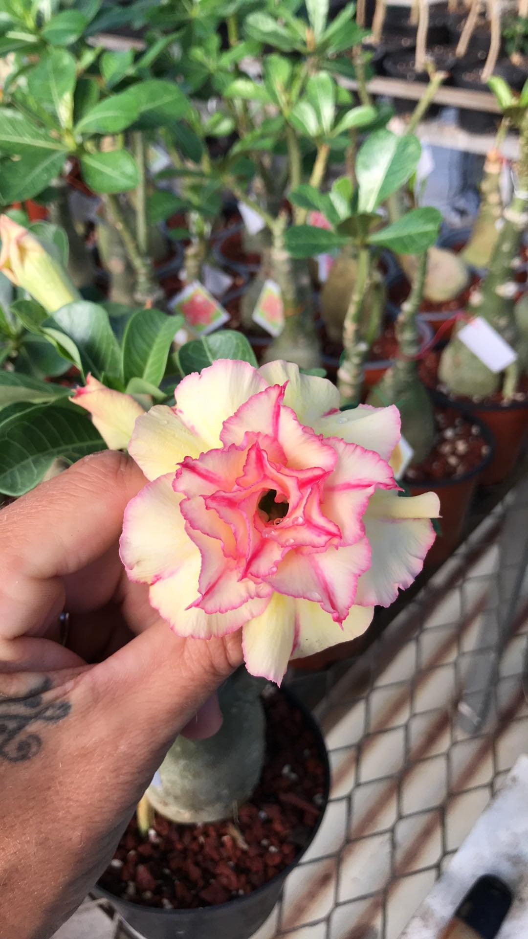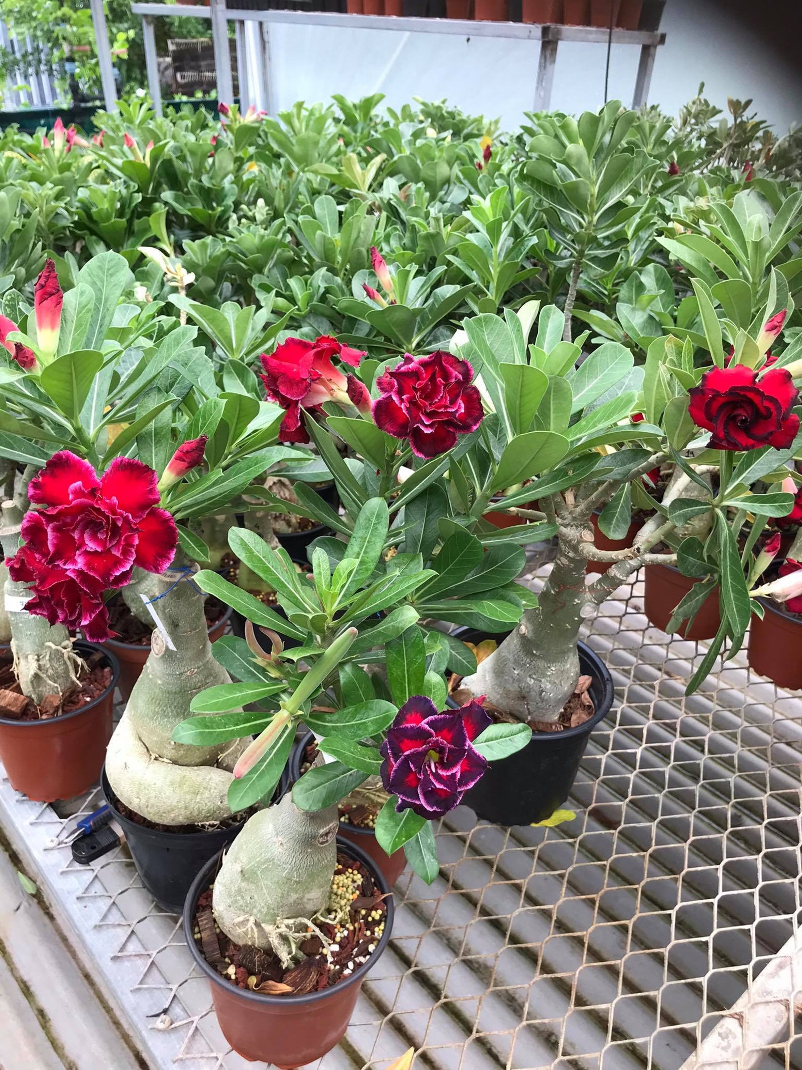 Toutes nos graines proviennent de pépinières européennes (et non de Chine) ***Elles proviennent de la dernière récolte pour garantir un taux de germination élevé SONT envoyées emballées dans des sachets transparents à fermeture éclair Découvrez les graines de Adenium obesum - Rose du désert au meilleur prix chez Semences du Puy. Semez des Plantes herbacées selon vos envies La Rose du Désert développe un tronc massif avec l'âge, mais fleurira très tôt, habituellement lorsqu'il aura atteint 6 de haut. Utilisez un mélange constitué de 2 parties de mousse de sphaigne pour une partie de sable. Il perdra des feuilles prématurément s'il est trop arrosé. Plante Succulente Graines TROPICA Lot De 8 Graines De Rose Du Désert (Adenium Obesum) Cacti / Succulents Desert Rose Zones de rusticité 9 -11, (4°C/40°F,-5°C/25°F) en Hivers. Il aime un sol légèrement alcalin. Arrosez régulièrement lors de la croissance, conservez plutôt sec en Hiver. De longues périodes sous 40°F (4°C) pourraient tuer le bout de certaines branches. Graines de fleurs de rose du désert de couleurs mélangées à planter Il a besoin de beaucoup de lumière et d'air frais. Rose du Désert - Adenium Obesum. Plante succulente* aux superbes fleurs rouges. Chaque pétale est marbré de blanc et se termine en pointe