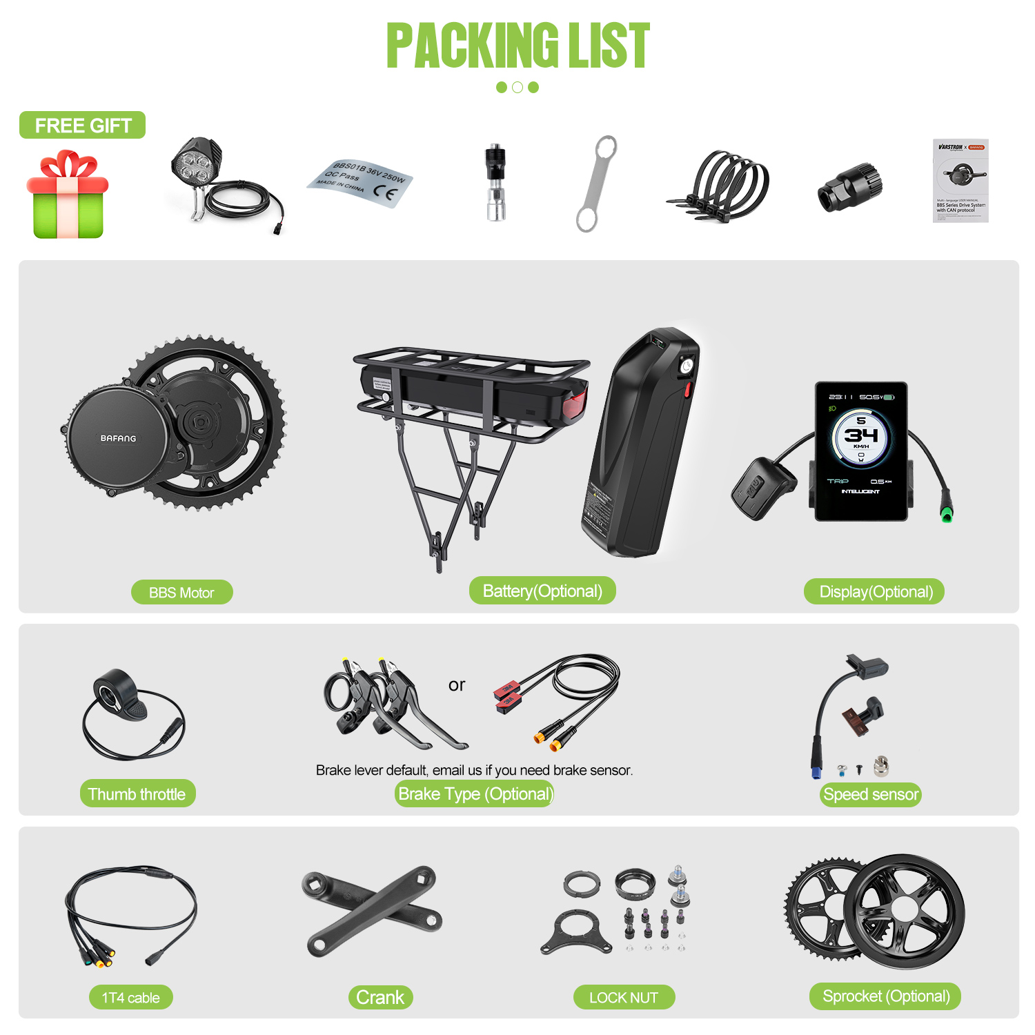 travail), choisissez des moteurs de 250 W à 500 W BBS-HD 250W 350W 500W 750W 1000W, Kit de Conversion pour vélo électrique 48V 52V avec Affichage LCD. 5,0 sur 5 étoiles 6. 1 offre à partir de 399,93 Le capteur de vitesse est également amélioré avec la technologie double Hall pour plus de précision. Contenu du kit : le kit de conversion BAFANG comprend tous les accessoires de base pour moderniser votre vélo sans achats supplémentaires : moteur central (protocole CAN), batterie (en option), écran LCD (en option), plateau (en option), capteur de vitesse, accélérateur de pouce, leviers de frein, câble principal imperméable 1T4, lumière avant, outils de montage Chaque batterie passe des tests rigoureux pour garantir rapidité et sécurité Options de batterie : disponible en différentes capacités : pour les trajets courts : batteries de 48 V 13 Ah ou 17,5 Ah. Énergie puissante pour vos parcours : choisissez un moteur de 250 W à 1000 W sur cette page en cliquant sur « Personnaliser maintenant ». Bafang – Kit de Conversion de vélo électrique 750W, BBS02B, BBS02, moteur à entraînement central Pour les déplacements urbains (par ex. Les autres écrans ou câbles ne sont pas compatibles pour la programmation Grâce à son couple moteur élevé, profitez de longs trajets puissants. Options du moteur : 250W (Légale routière européenne), 350W, 500W, 750W, 1000W (utilisation tout-terrain/privée). ·Tailles BB : 68 mm, 73... Batterie Vélo électrique Bafang Kit De Motorisation De Vélo Électrique, Modèle BBSHD 1000W BBS02B 750W 500W BBS01B 250W Moteur Mid Drive 250W 1000W Vitesses maximales par moteur : 250 W : 35 km/h, 350 W : 37 km/h, 500 W : 45 km/h, 750 W : 50 km/h, 1000 W : 55 km/h.