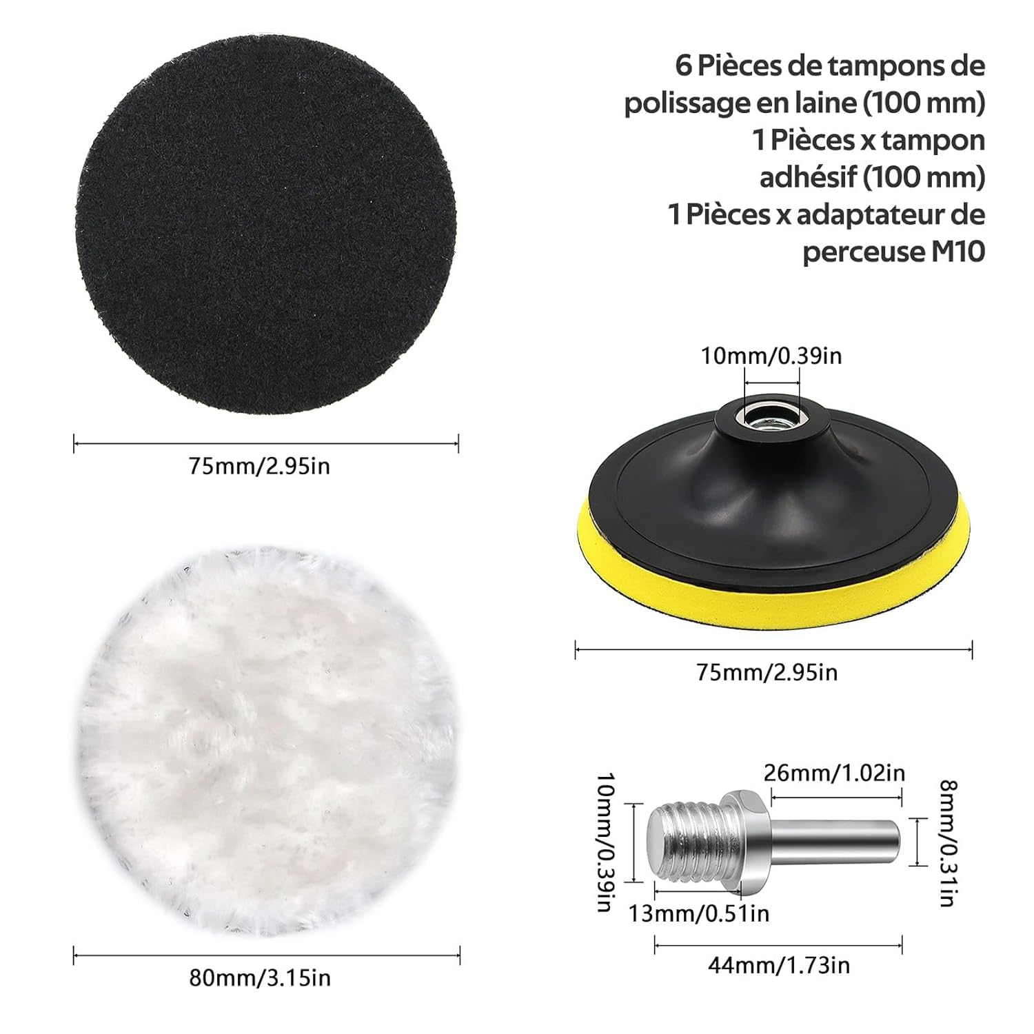 Spécification: Nom du produit: Tampon de polissage Matière: Laine Couleur: Blanc Quantité: 8 Application: Idéaux pour le polissage des voitures, mais aussi adaptés au verre, à la céramique, au bois, aux comptoirs Liste de colisage: 6 x Tampon de polissage 1 x adaptateur de perceuse 1 x vis de fixation -Les pads polissage s'attachent solidement à la machine à polir pour éviter les rayures et assurer une utilisation sûre. Le tampon de polissage peut être utilisé pour le cirage, le polissage et le glaçage de scellage de voiture. Paquet inclus. 6 x tampons de polissage éponge Convient non seulement pour polir ou cirer les voitures, mais aussi pour nettoyer le verre, la pierre, la céramique, les meubles, les produits en bois, l'acier inoxydable et d'autres surfaces. Économisez de l'argent tout en préservant l'environnement 【Facilité d'Utilisation】Légers et équipés d'un support adhésif, les tampons de polissage en laine peuvent être facilement changés en quelques secondes. Boule De Marcottage Kit 7 Tampons Polissage Voiture - 100mm - Pour Perceuse Blooming Gel L'adhésif robuste permet un démontage répété, rendant le polissage de la peinture de votre voiture rapide et sans effort, vous faisant ainsi gagner du temps et de l'énergie. 【Large Application】Ces kits polissage voiture ne se limitent pas seulement au polissage des détails de voiture ; ils sont également parfaits pour polir et nettoyer le verre, la céramique, les meubles en bois, les comptoirs, et bien plus encore. Polissage Cirage Automobile Demander Kit De Tampon De Polissage De Voiture 8 Pcs De 7 Pouces Polissage De Mousse Disques Tampon De Polissage 3 Pouces -Idéaux pour le polissage des voitures, mais aussi adaptés au verre, à la céramique, au bois, aux comptoirs, etc. 100mm Tampon Polissage En Laine, 6 Pièces Disque De Polissage, Pour Le Polissage Et Le Cirage De Voiture, Avec M10 Adaptateur De Perceuse -Comprend 6 kits de polissage, 1 adaptateur de perceuse et 1 vis de fixation. -Les tampons de polissage sont similaires à de la laine, doux et délicats, sans perte de fibres.
