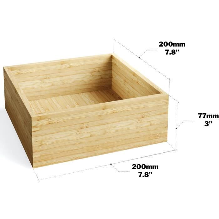 Avec une doublure en tissu amovible Chaque boîte offre suffisamment d'espace pour ranger les écharpes, les chaussettes, les sous-vêtements, etc. Rangez toutes vos affaires grâce à cette boîte multifonction à la fois pratique et élégante. La caisse en bambou constituée de 4 compartiments est parfaite pour stocker vos ustensiles de salle de bain, affaires de cuisine, petits objets dans le salon ou encore jouets dans la chambre d’enfant Le coffre en bambou ouvert vous permet d'organiser votre maison tout en décorant grâce à son charme naturel.boîte de rangement en bambou en détail- dimensions : h x l x p : env. 7 x 30 x 15 cm- poids : env. 380 g- matériau : bambou- optique : nature- lot de 4caisse de rangement empilable- utilisation très flexible à la maison et le... Pliable pour un rangement facile Boite de rangement bambou - Nature Bohème Remarque : cette boîte de rangement a un fond ouvert, La livraison contient : 4 x boîte de rangement Table De Rangement En Bambou KD Essentials – Boîte De Rangement En Bambou, Empilable – Moyenne Coffre De Stockage Avec Doublure Tissu Amovible Dimensions : 31 x 31 x 20 cm (l x P x H), Forme : Carré Ces boîtes de rangement pratiques conviendront parfaitement à presque toutes les étagères. Les boîtes de rangement sont fabriquées en bambou et en tissu tissé, qui sont assez durables.