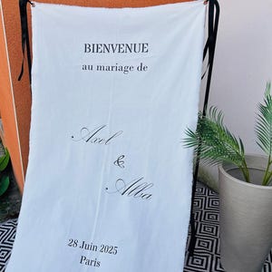 Panneau de bienvenue de mariage en tissu personnalisé - Accueillez vos invités avec une élégance intemporelle Faites une première impression durable avec notre panneau de bienvenue de mariage vertical fabriqué à la main — une touche magnifiquement personnalisée pour saluer vos proches lorsqu'ils arrivent pour célébrer votre grand jour. Panneaux de bienvenue de mariage personnalisés, bannière de mariage moderne en extérieur, panneau de bienvenue personnalisé, décoration personnalisée (70 x 200 cm Matériau : tissu de soie de haute qualité. Personnalisez votre propre bannière de citation de mariage avec vos noms et votre grand rendez-vous. Il est assez polyvalent pour s'adapter à n'importe quelle chaise, support, ajoutant une beauté esthétique au lieu de mariage tout en capturant vos sentiments de souvenir Tableau De Bienvenue Mariage Panneau Bienvenue Mariage Original - Mon Panneau De Mariage Affiche Bienvenue Mariage Personnalisé Inscription : imprimé avec de l'encre UV de haute qualité. Parfait pour les mariages rustiques ou bohèmes., 1., Panneau de bienvenue de mariage personnalisé en tissu : personnalisez avec vos noms, date de mariage, une citation spéciale ou tout message que vous désirez. Couleur d'encre noire, complète parfaitement votre thème de mariage. Chaque détail est soigneusement conçu pour refléter la joie de votre occasion, créant un beau rappel des moments qui méritent d'être mémorisés. Panneau bienvenue mariage en tissu Accueillez vos invités avec style avec notre panneau de bienvenue en lin fabriqué à la main. Mariage moderne et authentique à la ferme du Roy ~ Mademoiselle...