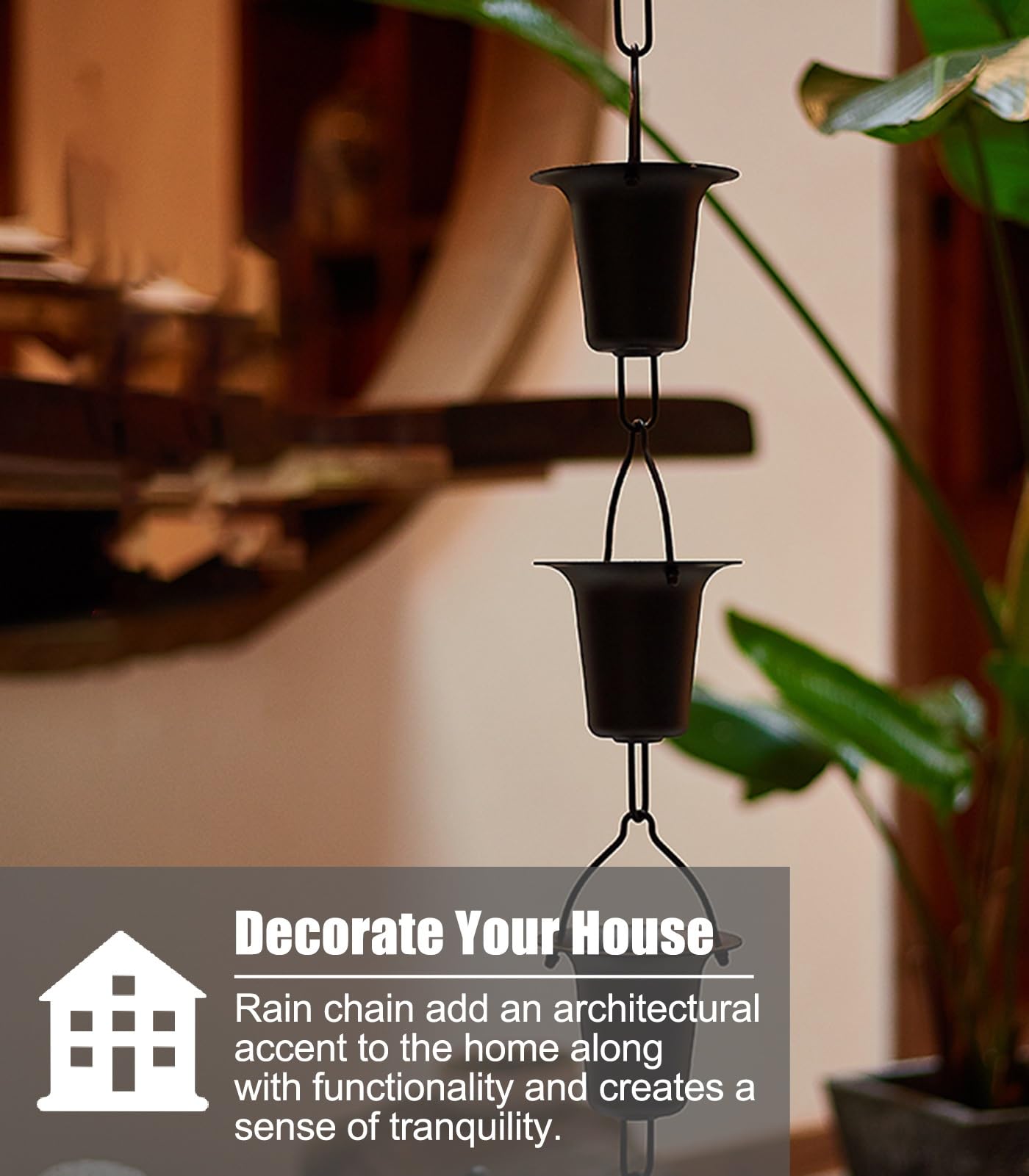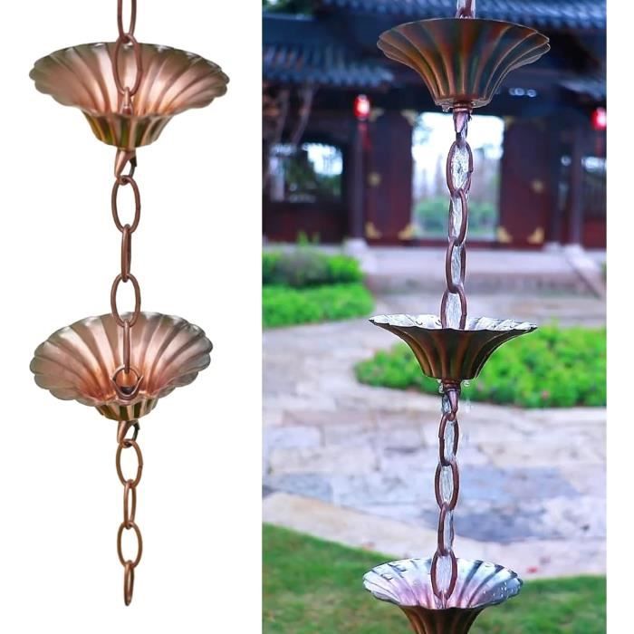 Polyvalence : La chaîne de pluie en cuivre est magnifiquement assemblée avec 57 maillons. Design artistique et fonctionnel, la chaîne de pluie est fabriquée en cuivre robuste de calibre 9 et est résistante à la rouille. Chaîne de pluie coupe pour gouttière, forme de accrocheuse, ajoute une touche d'élégance à votre espace extérieur. - Rapide facile à installer, la chaîne de pluie ne nécessite aucun outil pour être installée, accrochée directement à la gouttière Installation facile]: la chaîne de pluie en métal est livrée avec un crochet de suspension, ce qui permet une installation facile à l'extérieur. Aucun outil n'est nécessaire, accrochez le crochet sur le bassin ou le récipient souhaité et profitez du débit d'eau captivant Chaque maillon des chaînes de pluie pour gouttières mesure 5,1 cm de diamètre. 8 Feet Bronze Decorative Bird Rain Chain Mobile Metal Rainwater Catcher Chain De Améliorez l'apparence de votre façade : La chaîne de pluie est une belle alternative verte intelligente au remplacement des gouttières traditionnelles. Complétez l'esthétique en ajoutant l'un de nos kits réducteurs de gouttière, bassins ou piquets d'ancrage. Chaînes De Pluie Diverseur D'eau De Pluie, Chaîne De Pluie, Chaîne Attrape-pluie à Pétales De Style Japonais For Alternative Tuyau Descente Gouttière L'eau tombe en cascade sur chaque anneau des chaînes de pluie d'extérieur, créant une belle fontaine d'eau. Comme pour toutes les chaînes de pluie, quelques éclaboussures peuvent se produire. La chaîne de pluie en cuivre développe une belle patine brunâtre sur sa surface au fil du temps.
