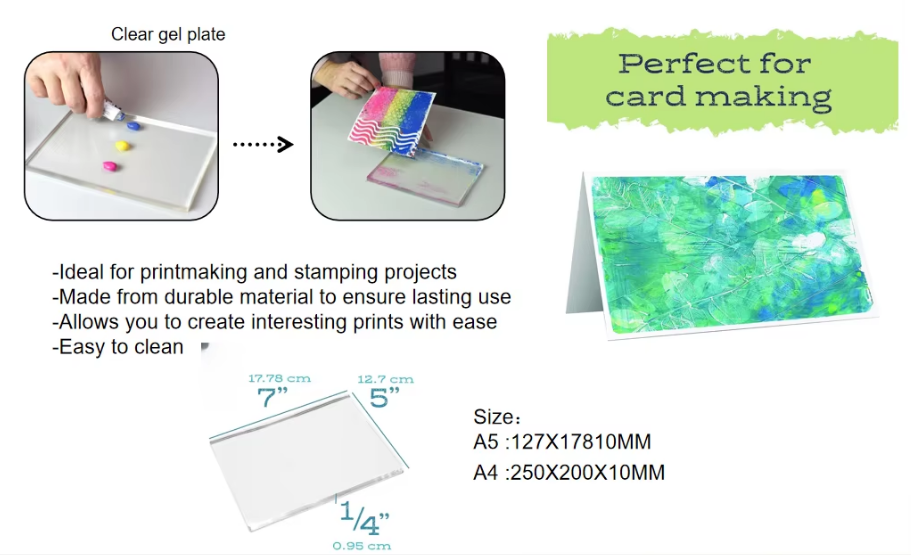Nous recommandons l'encre et l'aquarelle. Créativité et imagination : Laissez libre cours à votre imagination et créez vos propres motifs sur des plaques d'impression gel. Expérimentez avec différentes textures, couches et couleurs pour créer des impressions uniques et époustouflantes 2 : Lavez à l’eau et au savon doux et laissez sécher à l’air libre. Elles sont idéales pour la création de cartes, l'impression typographique, la gravure, le journaling, le scrapbooking et le collage. Polyvalent : Les plaques d'impression gel sont compatibles avec une grande variété de supports, notamment les peintures acryliques, les peintures à l'huile et les encres. Il suffit de les laver à l'eau et au savon doux, puis de les laisser sécher à l'air libre. Remarque : Retirez tout résidu de peinture de la surface de la plaque d'impression gel après chaque utilisation. Big Bag pour plaque d'amiante réutilisable devis sous 1h 3 : Les plaques d’impression en gel sont compatibles avec les peintures acryliques, les peintures à l’huile et les encres. Plaque d'obturation rectangle en polyuréthane réutilisable | Contact Plaque De Gel Pour Imprimer Plaque D'impression Pour Presse à Gel Gelli De Taille A3/A4/A5 Plaques De Gel Réutilisables Pour L'impression D'art, La Fabrication De Cartes, Le Scrapbooking Et La Journalisation Kit Créatif Gel Printing Réutilisable Facile à nettoyer : Les plaques d'impression gel sont faciles à nettoyer. 6 : Réutilisable, résistant à l’usure et à la corrosion., Instructions : 1., Appliquez l’encre : Pressez la couleur souhaitée sur la plaque d’impression en gel., 2., Appliquez l’encre : Appliquez la couleur souhaitée sur la plaque d’impression., Étalez-la., 3., Créez un motif : Utilisez l’encre étalable pour créer la forme ou le motif souhaité., 04., Impression – Après avoir créé le motif, placez du papier blanc sur la plaque d'impression et appuyez uniformément jusqu'à ce que l'encre soit appliquée., 05., Retrait du papier – Après avoir appliqué l'encre, retirez le papier pour révéler le motif., 06., Terminé – Votre magnifique impression facile à créer est terminée. Caractéristiques : Matériau : Gel + Caoutchouc Couleur : Transparent Dimensions du colis : 25 x 20 x 10 cm Plaque de gel A4 : 250 x 200 x 10 mm (8 x 10 pouces) / 523 g Plaque de gel A5 : 127 x 178 x 10 mm (5 x 7 pouces) / 243 g Contenu : 1 plaque de gel A4 1 plaque de gel A5 1 brosse rotative Facile à utiliser : Appliquez simplement de la peinture acrylique ou autre à base d'huile sur la surface, puis transférez la peinture sur du papier ou un autre support à l'aide de notre rouleau à peinture pour créer votre œuvre d'art unique. Les peintures acryliques et à base d'huile sont interdites.