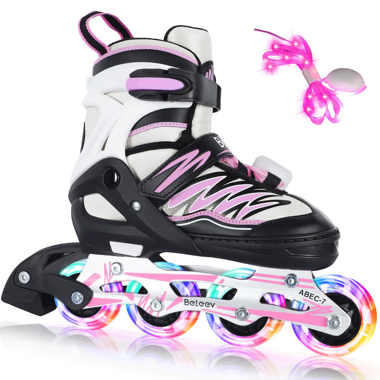 Que ce soit sur les planchers en bois à l’intérieur ou les trottoirs à l’extérieur, les enfants glissent sans effort. BELEEV Patins à roulettes réglables pour enfant - 4 tailles - Avec 8 roues LED lumineuses et lacets - Sûr et amusant - Pour débutant - Pour filles et garçons Roues et lacets lumineux colorés: Les 4 roues en PU de haute qualité s’allument automatiquement lors du patinage, créant un magnifique effet arc-en-ciel — pas de piles nécessaires. La structure stable à 4 roues apporte une balance supplémentaire, idéale pour les débutants qui apprennent à patiner et les patineurs qui pratiquent de nouvelles astuces. Grâce aux détails lumineux et aux fonctionnalités de sécurité, ils constituent un cadeau inoubliable pour les anniversaires, les vacances ou Noël. Protection à 3 couches et frein en caoutchouc: Nos patins à roulettes pour enfants disposent d’un système de fermeture à 3 couches — verrou à enclenchement sûr, sangle Velcro et lacets durables — qui maintient les pieds fermement en place. Ainsi, vous n’aurez pas besoin d’acheter de nouveaux patins chaque saison. Patins 4 Roues Lumineux Patins à Roulettes Enfants OHMG Réglables Glisse fluide et design stable: Nos patins à roulettes pour enfants sont équipés de roulements puissants ABEC-7 et de roues en polyuréthane 82A amortissantes — pour une glisse fluide, silencieuse et stable. Patins ajustables 4-en-1 pour les pieds en croissance: Nos patins sont dotés d’un réglage pratique à un bouton, qui permet de les adapter à 4 tailles différentes — un compagnon idéal pour les enfants en croissance. Les patins supportent jusqu’à 60 kg, idéal pour les jeunes patineurs et ceux en plein développement. Patins à Roulettes - Femme/Fille - Noir - Taille 38 - Résistant - Achat... Patin A Roulette Garcon BELEEV Patins à Roulettes 4 Taille Réglable, Skate Enfants Roues LED Lumineuses Réglez simplement sur la bonne taille, et votre enfant peut patiner confortablement pendant des années.