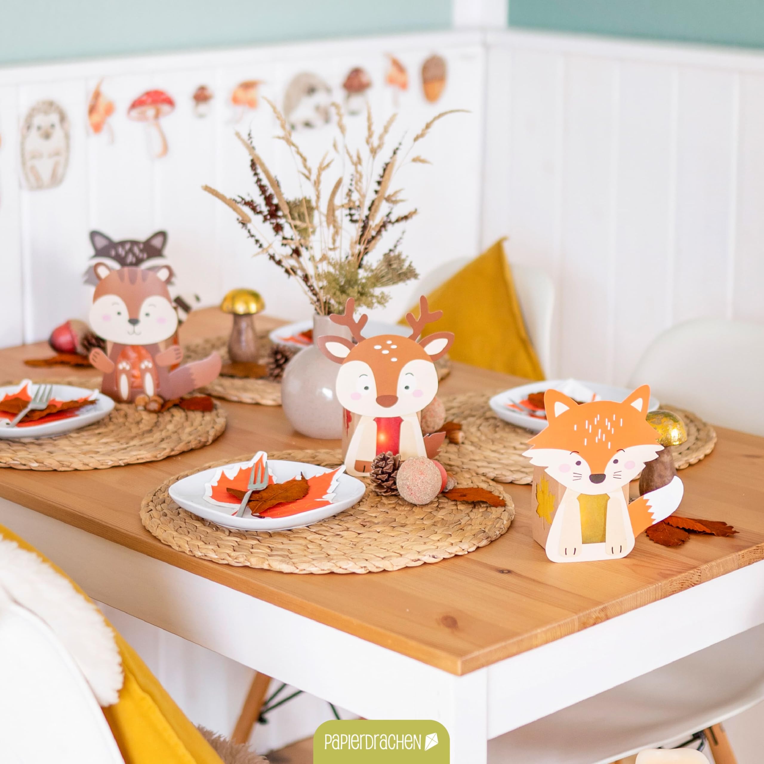 SET DECORATION POUR L'AUTOMNE : Cet adorable set complet contient 4 animaux de la forêt sous forme de photophores confortables. Pour des raisons de sécurité, nous recommandons une bougie chauffe-plat électrique SET DECORATION POUR L'AUTOMNE : Cet adorable set complet contient 4 animaux de la forêt sous forme de photophores confortables. Kit Decoration De Table Noel Papierdrachen 4 Photophores à Bricoler Pour Enfants - Renne, Raton Laveur, Renard, écureuil - Porte-bougies à Chauffe- plat - Kit De Bricolage Automne Set 1 Kit Bougie Enfant Chaque lanterne a la forme d'un animal de la forêt différent - renne, raton laveur, renard ou écureuil. DESIGN CONFORTABLE POUR LES ENFANTS : de jolis motifs tels que le renne, le raton laveur, le renard et l'écureuil créent une ambiance automnale chaleureuse. ENCORE PLUS DE CHOIX : Connais-tu déjà nos autres produits d'automne ? Chez nous, tu trouveras aussi d'adorables lanternes de la Saint-Martin, des guirlandes et des images de fenêtre en kit de bricolage. Elles conviennent parfaitement comme porte-bougies à réchaud et confèrent à chaque pièce une touche de convivialité. Sont inclus les sacs en papier kraft, les feuilles prédécoupées avec les animaux, ainsi que du papier transparent pour confectionner 4 adorables porte-bougies à réchaud dessin animé drôle raton laveur, hérisson et écureuil par temps d Sont inclus les sacs en papier kraft, les feuilles prédécoupées avec les animaux, ainsi que du papier transparent pour confectionner 4 adorables porte-bougies à réchaud. Pour des raisons de sécurité, nous recommandons une bougie chauffe-plat électrique. Elles conviennent parfaitement comme porte-bougies à réchaud et confèrent à chaque pièce une touche de convivialité.