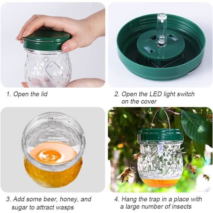 comme appât, suspendez-le ou placez-le sur votre balcon, votre cour de villa, votre tente de camping ou tout autre endroit, et il est prêt à l'emploi. Installation simple : Ce piège à frelons asiatiques ne nécessite aucun outil compliqué ni aucune expertise. Grâce à ce système, il est possible de fabriquer rapidement un piège à frelon asiatique avec une bouteille en plastique. D’ailleurs, ce piège est très résistant et peut aider à la capture d’autres insectes volants, comme des mouches, des moustiques, etc HBM PIEGE A GUEPES ET FRELONS - Jardin Conception efficace à double entrée : Notre piège à frelons asiatiques adopte une conception unique à double entrée, telle une « porte d'accueil », ciblant spécifiquement les insectes tels que les guêpes et les frelons. Quels Sont Les Trois Pièges Naturels à Guêpes Et Frelons Asiatiques Pour Proteger Votre Jardin Piège à abeilles multifonction : Ce piège est une excellente solution pour éliminer les guêpes, les frelons et autres insectes de manière sûre et non toxique ! Il suffit de suspendre l'appât dans votre cour, jardin, verger, ferme et autres espaces extérieurs où les guêpes sont présentes. ODIPIE Piege Frelon Asiatique,Piege A Guepes Et Frelons Exterieur À Suspendre,Kit Piege A Frelon Exterieur A Suspendrekit Piege A Frelon Pour Bouteille Plastique Interieur Piege Moustique Mouche Moucheron 4pc 87708099 Ajoutez simplement des ingrédients courants comme de l'eau sucrée, du miel, du jus, etc. Après chaque utilisation, il suffit de le laver à l’eau chaude savonneuse pour le recycler., 4., Installation facile : ajoutez simplement de l’eau sucrée, du miel, du jus ou de la bière comme appât dans le piège, allumez l’interrupteur, puis suspendez ou placez le piège à abeilles sur une surface plane., Remarques :1., Veuillez prévoir de légères erreurs dues à la mesure manuelle., 2., En raison des différences entre les écrans, la couleur réelle de l’article peut varier de celle de la photo., 3., Nous vous souhaitons un bon shopping en ligne ! Attirez rapidement les insectes volants gênants :piege a frelon Versez simplement un mélange sucré de sucre, de miel, de jus, de vinaigre de cidre ou de fruits, et en quelques minutes, vous verrez ces insectes indésirables piégés !
