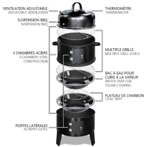 Fumoir Saumon Barbecue Au Charbon De Bois, Grill XLL à Charbon Avec Couvercle Gril Chromé Résistant Poignées Le couvercle et les côtés de l'appareil sont équipés de poignées pour faciliter l'accès et éviter les brûlures. Multifonction : ce barbecue fumage 3 en 1 a une fonction barbecue, fumage et braisage, de sorte que vous pouvez facilement préparer du bacon, des saucisses, du poisson grillé, des rôtis et d'autres types d'aliments. 1 manuel d'utilisation en anglais. Vous pouvez contrôler le vent en fonction de la température affichée sur le thermomètre pour cuire les aliments à la bonne chaleur. Il vous suffit d'étaler les aliments avec de la sauce, de les placer sur le barbecue multifonction et de régler correctement la chaleur pour préparer de délicieuses viandes grillées, des ailes de poulet et d'autres délices. Les aliments sont plus délicieux lorsqu'ils sont cuits à la bonne chaleur. Force du vent réglable : le fumoir multifonction dispose d'un thermomètre et d'un amortisseur réglable. Thermomètre Le couvercle est équipé d'un thermomètre qui vous permet de surveiller à tout moment la température à l'intérieur du four afin de régler correctement le vent. Aberdeen Barbecue combiné 2 en 1 gaz et charbon de bois | Surface de Gril chromé La surface du fumoir multifonctionnel est chromée afin de la rendre résistante à la corrosion et à la chaleur. CONCEPTION IDÉALE : thermomètre intégré qui vous permettra de vérifier et réguler la température si besoin - Barbecue de jardin avec les roues et la poignée, le barbecue se déplace sans difficulté - Poignées en bois isolant thermique empêchant les brûluresCe barbecue au charbon avec couvercle est un incontournable pour tous les... Tous les accessoires nécessaires pour l'installation, ------------------ Cela rend le fumoir plus durable et plus robuste. Et son poids léger vous permet de le déplacer facilement. 2 filets cuits au four., 1 filet en carbone., 2 portes d'accès., 3 poignées. 1 anneau de four inférieur., 2 bacs en émail. Hauteur du produit : 84 cm Notre barbecue au charbon de bois 3 en 1 est parfait pour fumer, griller et cuisiner en plein air avec la famille et les amis. Notre fumoir dispose d'une surface de cuisson généreuse (2 grilles en acier inoxydable Contenu de la livraison 1 couvercle., 1 thermomètre., 1 amortisseur réglable. Poids net : Environ 7 kg