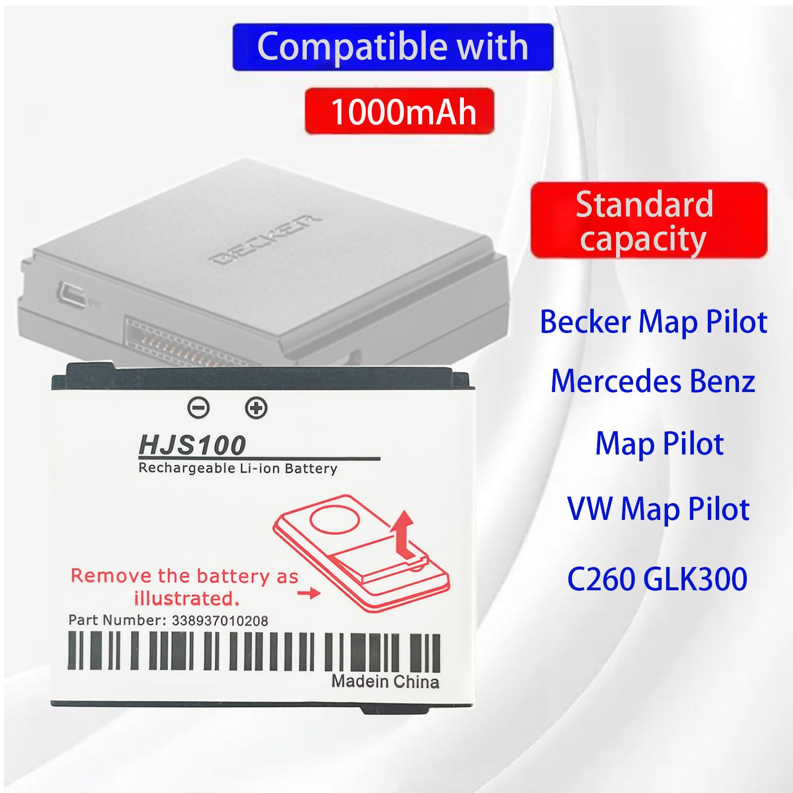 Nous vous répondrons dans les 24 heures pour résoudre les problèmes 100mAh/3.7Wh 3.70V Becker HJS100 für Becker HJS100 HJS-100 Map Pilot Package Included: 1PCS Batteries de remplacement haute performance d', conçues sur mesure pour Mercedes Benz Becker Navigation Map Pilot HJS100. Remplacement de la batterie Mercedes Benz Becker Navigation Map Pilot HJS100 - avec une qualité égale ou supérieure à celle des batteries d'origine Plus de vidéos sur YouTube. 2【Spécifications】 Capacité : 1000 mAh ; Tension : 3,7 V ; , Contenu : 1 batterie Akku kompatibel mit Becker 338937010208, HJS100 - Li-Ion 900mAh - für... 5 【Contactez-nous】 Si vous avez des questions, n'hésitez pas à nous contacter. [À propos de l'utilisation de batteries compatibles] 1., Selon l'environnement d'utilisation, la capacité restante de la batterie est affichée différemment., 2., Pour recharger la batterie, il est recommandé d'utiliser le chargeur d'origine ou de charger le corps du téléphone., 3., La nouvelle batterie peut être chargée et déchargée 350 à 500 fois en cycle normal. Batterie Map Pilot Bateria De Reposição Para Becker HJS100 HJS-100 Map Pilot - PT-B2120006 Batterie Map Pilot Mercedes