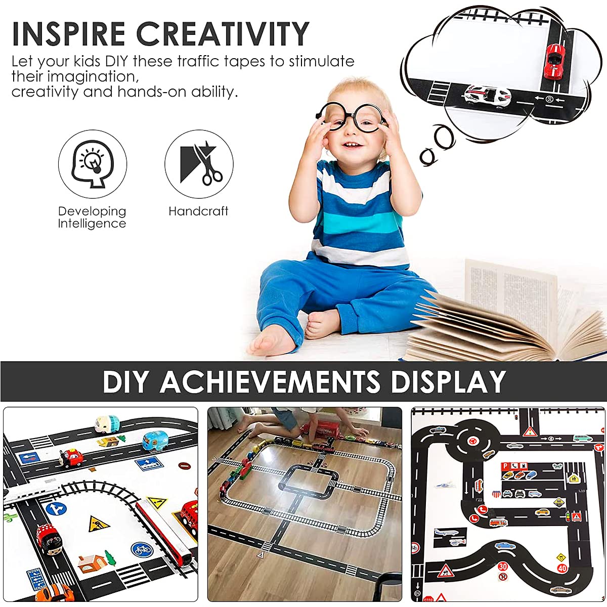 Sans résidus et doux : le ruban adhésif de rue pour enfants est fabriqué en matériau souple qui se retire facilement et ne laisse aucune trace. Utilisation polyvalente : parfait pour les pistes de jeu pour les enfants, le modélisme de route, le scrapbooking, l'emballage cadeau ou les œuvres d'art. Équipement de finition Ce kit de ruban adhésif routier pour enfants apporte créativité et plaisir en un coup d'œil – il permet non seulement de concevoir des mondes de rues détaillées, mais stimule également l'imagination. Utilisation polyvalente : en plus des pistes de jeu pour enfants, le kit est adapté pour les projets artistiques, l'artisanat ou le scrapbooking. Applications appropriées : routes de jeu pour enfants, scènes de voitures jouet, travaux manuels, scrapbooking, projets d'art, modélisme routier. 【Facile à utiliser】 Sans opération compliquée : les rouleaux sont faciles à découper, les autocollants adhèrent fermement mais doucement. Comprendre les règles de la circulation de manière ludique. Un moyen ludique de promouvoir la motricité fine et la pensée logique Découvrez les différents types de ruban adhésif d'emballage - Scell'tech Ruban Sans Résidus Repositionnable YUBX Road Railway Washi Tape Set Ruban Adhésif Papier Décoratif 4 Rouleaux Masking Tape Pour Washi Tape Route Que ce soit à la maison, à la crèche ou lors de soirées de bricolage, il devient un compagnon populaire pour les jeunes explorateurs et les cœurs créatifs. Ludique et éducatif : aide les enfants à développer leur motricité fine et leur imagination tout en reconnaissant les panneaux de signalisation et en créant leur propre monde de route. Autocollants Washi Tape : le ruban adhésif pour routes est fait de matériau Washi, se décolle facilement et ne laisse aucun résidu, collez comme vous voulez, train train route Washi Tape Set Masking Tape est sans danger pour les sols, les murs et les meubles Facile à utiliser : le ruban adhésif et les autocollants sont faciles à positionner et à réorganiser – Idéal pour les jeunes enfants pour jouer et bricoler de manière indépendante. Que ce soit sur du bois, du papier ou des meubles, il protège les surfaces, idéal pour la maison ou la salle de jeux Sans résidus : la surface adhésive spéciale se retire facilement sans laisser de traces sur les meubles, le papier ou les murs - Sans danger pour les chambres d'enfants et les projets d'artisanat. Les éléments noirs et blancs et colorés se combinent pour créer des designs uniques - Pour les enfants et les adultes