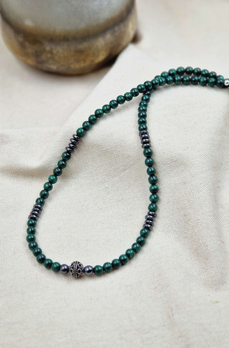 Le fermoir mousqueton en acier inoxydable assure une fermeture fiable tout en résistant à l'usure du quotidien. Collier Malachite et Perle – Charme Naturel, Argent Plaqué Or Ce collier malachite homme est réalisé à la main,avec des pierres naturelles non traitées – chaque pièce est une ode à l'authenticité. Matériaux Naturels: Les perles de coquillage apportent une touche organique et lumineuse, tandis que la malachite, avec ses nuances vertes et ses motifs uniques, ajoute une profondeur minérale Bonne Idée Cadeau: Emballé dans un coffret cadeau sophistiqué, ce collier malachite homme est un présent idéal pour un anniversaire, la Fête des Pères ou tout autre événement spécial Collier Homme Malachite Et Rondelles Hématite Bijou Homme Pierre Naturelle Disponible en deux longueurs–50cm et 60cm–le collier malachite homme s'adapte aux différentes préférences de style et de port. Design Masculin et Polyvalent: Avec ses perles de 6mm, ce collier homme offre une présence discrète mais élégante. Deux longueurs adaptables: Le modèle 50cm offre une longueur classique idéale pour un port près du cou avec des tenues formelles, tandis que le 60cm propose une version plus longue parfaite pour un style décontracté Ce collier perle homme est pensé pour accompagner chaque moment de la journée, du bureau au dîner, tout en ajoutant une note personnelle et distinguée. Collier en Malachite Dark (foncée) du Congo de Qualité AA, Boules Dégradées de 5 à 12 mm - Les Pierres de Pascal Le choix des matériaux reflète une recherche d'esthétique et de qualité: les perles de coquillage apportent une finition lisse et lumineuse, tandis que la malachite, pierre d'un vert profond caractéristique, confère au collier une dimension plus marquée et structurée. Ce collier est conçu pour l'homme moderne en quête d'élégance discrète et de style intemporel. Ce collier perle de coquillage homme apporte une touche...