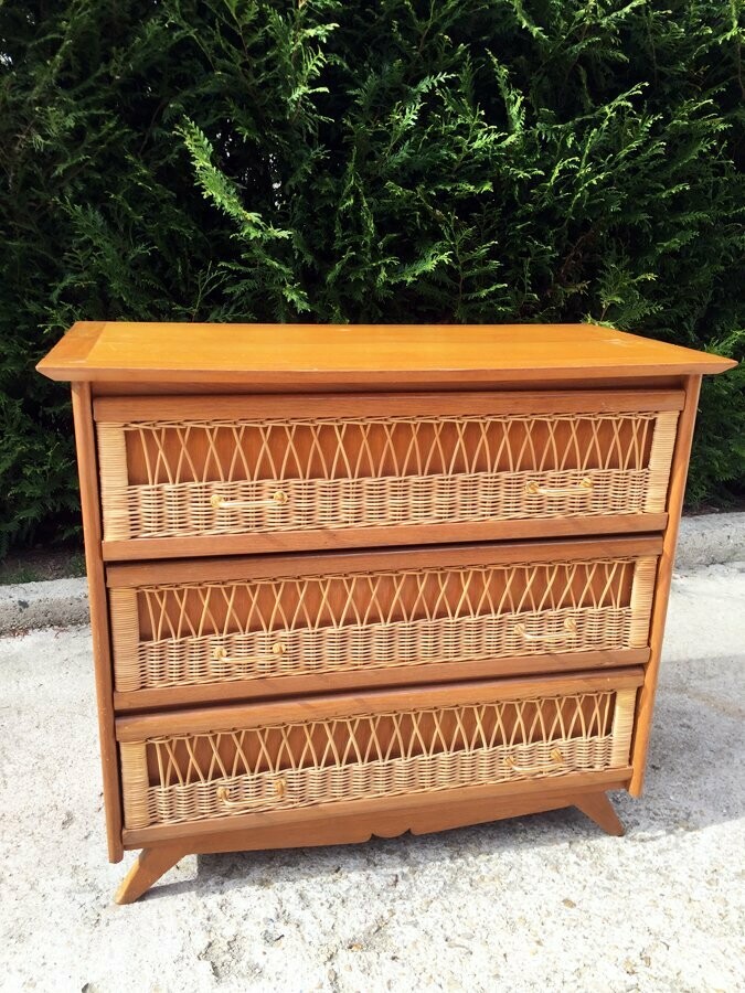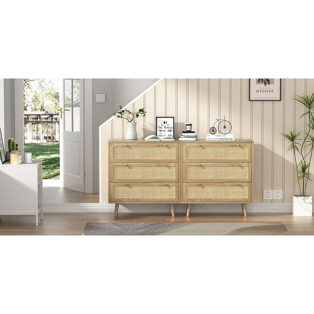 Commode Design Moderne Pieds Bois Commode 3 Tiroirs 110x40x75,5 Cm En Rotin Et Bois Naturel - MAGUY | Maison Et Styles Commode 100 Cm Largeur Fabriqué en bois massif de haute qualité et en rotin naturel tressé à la main, ce tiroir est durable et facile à nettoyer. Le petit tiroir supérieur (environ 28 x 34 x 18 cm) est doté d'orifices de ventilation pour garder les objets au sec, ce qui le rend idéal pour ranger de petits objets tels que des bijoux, des produits d'hygiène et de la papeterie Découvrez notre sélection de commodes 5 tiroirs sur notre site ou directement dans le magasin le plus proche de chez vous Avec une capacité de charge allant jusqu'à 68 kg, il allie rangement et présentation pour s'adapter à tous les intérieurs. Ce meuble convient à de nombreux espaces, comme les chambres, les salons et les entrées. Chiffonnier SEETA Petite Commode De Rangement Avec 4 Tiroirs Au Style Vintage Retro En Bois De Paulownia Lasure Brun Et Rotin Un dispositif anti-basculement intégré garantit une utilisation sûre, ce qui le rend particulièrement adapté aux familles avec enfants ou animaux domestiques. Toutes les photos du produit sont prises avec le produit réel, mais il peut y avoir une différence de couleur en raison de la lumière du soleil et d'autres facteurs. Sa conception à 5 tiroirs permet de ranger facilement une grande variété d'objets. La surface supérieure de 100 cm de large accueille des objets de décoration, des diffuseurs d'aromathérapie, des machines à café, etc. Le grand tiroir inférieur (environ 57 x 34 x 18 cm) est parfait pour les vêtements, les couvertures, etc. Les pieds en bois massif sont à environ 15 cm du sol, ce qui facilite leur nettoyage et permet aux robots aspirateurs et serpillères de manœuvrer sans effort. Chaque tiroir est équipé de rails de guidage silencieux, assurant un coulissement fluide, même à pleine charge. Le savoir-faire artisanal exquis crée un jeu de lumière subtil, idéal pour les chambres, les salons ou tout intérieur moderne, rehaussant l'ambiance générale.