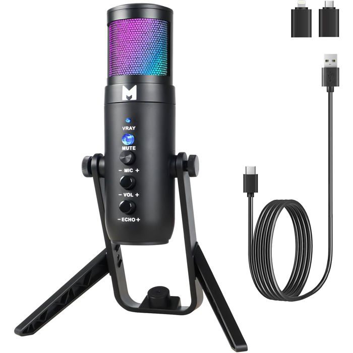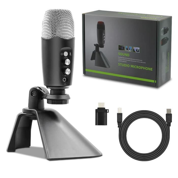 Microphone USB RGB Kowell Store Microphone De Jeu USB Pour Streaming, Podcasts, Enregistrement, Microphone à Condensateur Pour Ordinateur De Bureau Sur Mac/PS4/PS5, Avec Contrôle RVB, Toucher Silencieux, Prise Casque Microphone Streaming Podcast Commande de sourdine et de volume à une touche 【Éclairage RVB dégradé】Cet adaptateur micro USB pour PC et mobiles offre des effets d'éclairage RVB dégradés dynamiques et cycliques. Cela améliore la qualité audio et offre un meilleur contrôle sur le son enregistré. 【Gain du microphone et surveillance en temps réel】 Le contrôle du gain situé à la base du microphone USB permet aux utilisateurs de régler le volume directement depuis le microphone du studio, ce qui facilite les réglages pendant les sessions de jeu ou de streaming. 【Que recevrez-vous ?】Microphone RVB*1, filtre anti-pop métallique*1, boîte d'emballage*1, câble USB Type-C*1, manuel d'utilisation*1 En branchant un casque avec une prise jack 3,5 mm sur ce microphone de jeu, vous pouvez entendre votre propre voix sans délai et la surveiller en temps réel pendant que vous jouez, diffusez, podcastez ou enregistrez. Idéal pour les gamers et les créateurs de contenu, il offre une expérience immersive et laisse une impression visuelle durable à votre public. Rotation à 360 degrés Microphone à condensateur RGB - Professionnel - USB - Compatible iPhone et Android - Cardioïde Microphone flexible et robuste : rotation à 360 degrés et base lestée pour une sortie audio optimale. Le microphone de streaming pour PC gaming offre une qualité sonore nettement améliorée et des conversations en ligne précises avec vos coéquipiers sur Discord ou autres plateformes La suspension antichoc incluse maintient le microphone de studio en place, absorbe les vibrations et réduit les bruits externes. Voyants lumineux LED clairs L'éclairage RVB adaptable améliore vos diffusions en direct, vos sessions de jeu, vos enregistrements vidéo, vos podcasts et bien plus encore, créant ainsi une atmosphère immersive. 【Plug and Play】Ce micro USB RGB est très facile à installer. Surveillez et réglez le volume sans délai. 【Bouton à double fonction】Appuyez sur le bouton de mise en sourdine situé à l'avant du microphone de jeu pour couper rapidement le son. Microphone USB : Pas besoin de pilotes supplémentaires, TECURS microphone pc est compatible avec Windows, MacOS, Linux et Android, adapté pour PC/téléphone /PS4/PS5 Moniteur à délai nul Le bouton de gain permet de régler le volume en temps réel sans avoir besoin d'un ordinateur, ce qui réduit la charge de travail en post-production (connexion USB uniquement).
