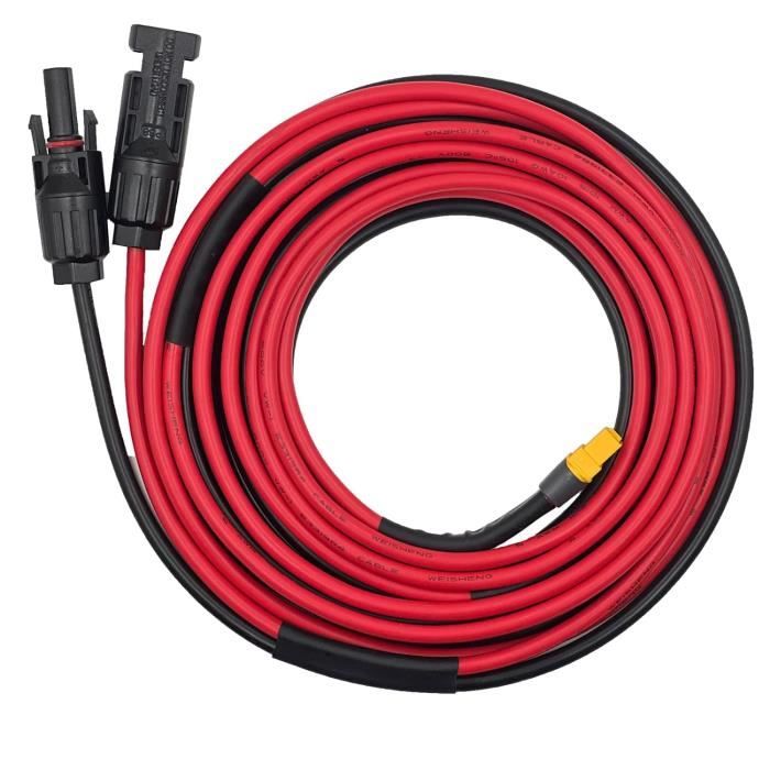 Interface : se connecte au panneau solaire de batterie du véhicule., Quantité : 1 pièce. Matériau du conducteur : cuivre étamé. Câble adaptateur solaire - Connecteurs MC4 vers XT60 Le câble est composé de fil de cuivre étamé 12AWG, ce qui minimise la perte de puissance et améliore au maximum l'efficacité de la charge Excellence robuste : Fabriqué en fil de cuivre 100 % pur avec isolation XLPO, il garantit des performances robustes et fiables. Hautement flexible : La flexibilité est essentielle. Facile à utiliser, il permet d'installer plusieurs panneaux solaires connectés à votre centrale électrique. Résistant aux UV et aux intempéries : Conçu pour résister aux conditions les plus difficiles Connecteur large utilisation : utilisé pour connecter le panneau solaire et le générateur solaire, universel pour tous les kits de panneaux solaires avec connecteur MC4., Faible perte d'énergie : câble d'extension solaire 12 AWG, longueur 0,5 m, assez long, mais il est très flexible. EcoFlow MC4 to XT60 Solar Cable 3.5m - Flying Eye Matériau imperméable : matériau de haute qualité assurant la transmission dans une situation stable. Câble MC-4 vers XT60 : branche en Y : une extrémité est MC-4 (prise de panneau solaire, mâle/femelle), l'autre extrémité est un connecteur XT60, prend en charge tous les panneaux solaires de sortie MC-4 pour charger le générateur solaire d'entrée XT60., Fixez fermement l'équipement, aucune étincelle ne sera générée, et la double isolation ne vous inquiétez pas des problèmes de sécurité Câble Adaptateur MC4 XT60 HUAREW Câble D'Extension De Panneau Solairevers XT60, 12AWG Câble De Panneau Solaire D Adaptateur Mc4 Vers Xt60 Longueur du câble : 0,5 m. Caractéristiques : Matériau d'isolation : PVC., Type : XT60., Type de câble : 2468 12 AWG. Interface du câble : XT60 femelle vers connecteur MC4 mâle femelle.