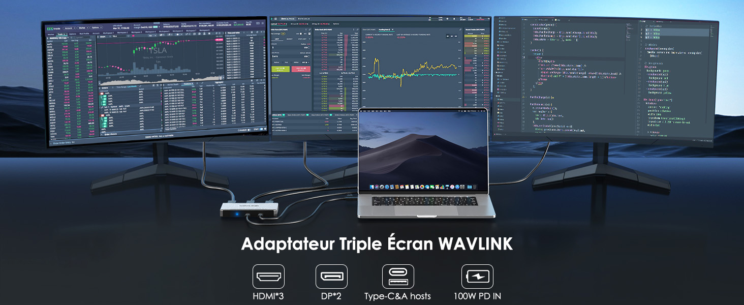 Compatibilité - Compatible avec une large gamme de systèmes d'exploitation, y compris Windows 11/10, Mac OS 13., x et supérieur, Android, Chrome OS, Harmony OS et Ubuntu. Station d'accueil triple moniteur : vous pouvez facilement connecter trois écrans 4K60@Hz que vous soyez Mac ou Windows. Découvrez la sortie haute définition spéciale 4K @ 60 Hz sur le port HDMI (Alt.Mode) pour des tâches telles que le montage vidéo et le travail de bureau Triple écran 4K - Si vous êtes toujours préoccupé par le prix élevé de Displaylink et l'incapacité des produits MST à étendre plusieurs écrans pour Mac OS, venez essayer notre dernière technologie. Ce produit nécessite un pilote, il n'est pas compatible Plug & Play, veuillez suivre le manuel d'utilisation et télécharger le pilote. Non recommandé pour les jeux ou les clips vidéo. Sur Mac, la rotation de l'écran n'est pas disponible et le mode Clamshell n'est disponible que sur Mac OS 13., x ou version ultérieure. Connexion flexible - DP ? HDMI ? USB A ? USB C ? Vous n'avez pas besoin de décider lequel vous pouvez utiliser. HDMI Adapter, WAVLINK Triple Monitor Adapter for M1/M2/M3/M4 Le port USB-C vers USB-A ne prend pas en charge la charge de votre ordinateur portable, veuillez utiliser le port USB-C pour le recharger Les adaptateurs triple moniteur WAVLINK peuvent étendre 3 écrans pour votre ordinateur et tous sont en résolution 4K @ 60 Hz. Cet adaptateur triple écran dispose d'une puissance de 100 W, 95 W pour charger votre ordinateur portable. Triple Moniteur Portable Double Écran Pour Ordinateur Portable, 15... Adaptateur Triple écran Adaptateur Triple Moniteur Pour Systèmes MacOS M1/M2/M3/M4 - Accessoires Informatique Adaptateur Triple écran Mac Cet adaptateur triple moniteur est équipé de 3 hôtes HDMI, 2 DP, Type-C et A et offre tout ce dont vous avez besoin !