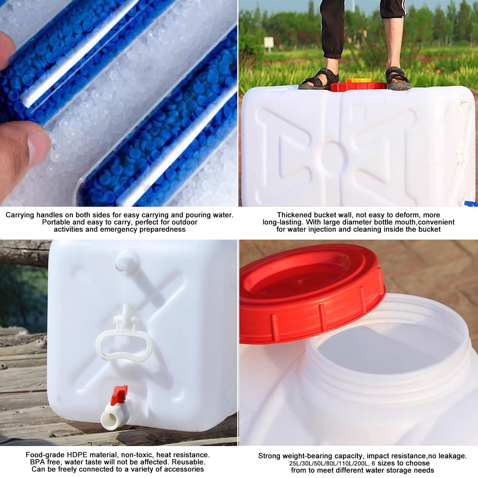 Matériau : polyéthylène haute densité (matériau de qualité alimentaire). La poignée latérale permet de les transporter facilement. Il est livré avec un robinet, un ruban adhésif et un tuyau de 3 m de long. 【Food Grade Plastic】 : Le récipient à eau est fabriqué en polyéthylène épais de haute densité de qualité alimentaire, sans odeur, résistant à l'abrasion, de haute dureté, de sorte que l'eau ne sera pas affectée. Principalement pour l'eau potable en extérieur ou pour le ménage. 12L Reservoir Eau Camping Car,Portable Bidon d'eau avec Poignée... Reservoir Eau Camping Car avec Robinet,Jerrican Alimentaire avec Tube d 【LARGE CAPACITE】:6 tailles : 25L/6., 6gallon, 30L/7., 9gallon, 50L/13., 2gallon, 80L/21gallon, 110L/29gallon, 200L/53gallon, Il peut répondre aux différents besoins des voyages extérieurs sur de longues distances, de l'irrigation et des besoins en eau de la maison. 【MULTIFONCTIONNEL】 : Parfait pour les activités de plein air comme le camping, l'escalade, le VR, la chasse, la randonnée, le sac à dos, la pêche, les pique-niques, les barbecues, les sports, les festivals, les fêtes , la plage, l'utilisation quotidienne. Avec des raidisseurs, qui ne sont pas faciles à déformer pendant l'utilisation. Le produit est filmé par une caméra, ce qui provoque généralement une aberration chromatique due à la lumière, à l'écran, etc. Conteneur Eau Portable YZRXD Bidon Eau Avec Robinet, Grande Capacité Réservoir Bidon Eau Plastique Bouchon bleu 10cm pour Jerrican alimentaire - Camping-car Escalade, VR, chasse, randonnée, sac à dos, pêche, pique-nique, barbecue, sports, festivals, fêtes, plage, usage quotidien. Ils sont résistants à la chaleur et aux chocs, ne se déforment pas facilement, sont solides et durables. Couleur : blanc Remarques : Le produit est mesuré à la main, il peut y avoir une erreur de 3 à 5 cm. Les tonneaux en plastique de qualité alimentaire peuvent être utilisés pour stocker de l'eau, du vin, de l'huile, du vinaigre, des produits chimiques, etc. Caractéristiques : Facilement empilable et peu encombrant, solide et durable, réservoir d'eau portable pour l'extérieur., 6 tailles : 25L/6., 6gallon, 30L/7., 9gallon, 50L/13., 2gallon, 80L/21gallon, 110L/29gallon, 200L/53gallon Possibilités d'application : camping en plein air, tourisme, maison, usine, champ, industrie, etc. La conception du robinet permet de contrôler de manière flexible la sortie de l'eau, et d'autres accessoires peuvent être installés en fonction de vos besoins, ce qui rend l'utilisation plus pratique.