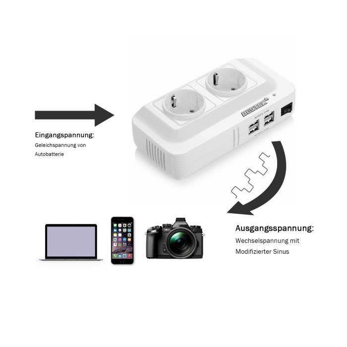 [Super durable] Le boîtier en alliage d'aluminium robuste offre une protection avancée contre les chutes et les chocs. EN STOCK : Onduleur de voiture 200W, convertisseur de puissance 12V à 220V, prise Standard européenne, noir TONCHEAN, 9588674575617 pas cher. Livraison rapide partout en France Conçu comme un onduleur portable haute performance qui peut alimenter plusieurs charges pendant la conduite. [Contenu de la livraison] : convertisseur 200 W, manuel d'utilisation (français non garanti). Échange gratuit en 1 an. Notre garantie de 24 mois et notre meilleur service client. [Vraiment puissant] Inverseur de 200 W, ultra compact, léger, de taille portable, peu encombrant, facile à ranger dans votre boîte de rangement. SUPAREE Convertisseur Inverter 12v 220v Power Inverter 200W Protection multiple : surcharge, court-circuit, surchauffe, inversion de polarité, sous-tension/surtension. Démarrage : démarrage progressif. Petits téléviseurs, ordinateurs portables, téléphones portables, tablettes, etc. BYGD Convertisseur 12v 220v 200W / 400W onduleur de Voiture, avec 3.1A Double transformateur de Chargeur Rapide USB multicolore : : High-TechÀ propos de cet article [Caractéristiques]Le puissant onduleur de 200 watts fournit une alimentation continue de 12 V CC à 220 V 230 V CA (puissance de pointe de 400 watts), avec 2 ports USB 3.1A pour le chargement, et il est léger et... Onduleur Voiture 200w Usb Qc3.0 Prises Allume-cigare Convertisseur 200W OBEST - 12V/24V Vers 220V - Ports USB Et Prises - Pour Voiture Et Camping Convertisseur 200W OBEST 12V/24V 220V USB QC3.0 Allume-cigare Utilisez vos petits appareils à tout moment et n'importe où.