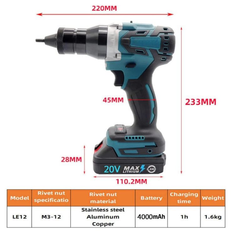 EN STOCK : Lot de 6 pinces à écrou à riveter M3 M4 M5 M6 M8 M10 - Riveteuse manuelle, écrous à sertir - Outil de rivet manuel - Conçu pour les espaces étroits, YF56498-CYRILLk0038250605-003 pas cher. Livraison rapide partout en France Cela vous aide à faire le travail sans erreurs. Riveteuse Professionnelle Vitesse Variable Pince à écrous à Riveter électrique M3/M4/M5/M6/M8/M10/M12 Pistolet à Riveteuse Electrique Pistolet à rivets électrique portable 26 V, puissant outil de rivetage pour pistolet à rivets électrique sans balais. Spécifications des écrous à rivets : M3/M4/M5/M6/M8/M10/M12., ♦ 【Dites adieu au fonctionnement manuel】 Cliquez simplement sur l'interrupteur pour riveter et dévisser automatiquement l'écrou. ♦【Conception de dissipation de la chaleur】 L'outil manuel de rivetage sans fil comporte plusieurs trous pour la dissipation de la chaleur et un refroidissement rapide, ce qui le rend moins susceptible de chauffer. Ensemble de pistolets à riveter rechargeables]Pas de restriction de câble, il suffit de connecter la batterie et vous pouvez l'utiliser n'importe où, plus pratique que les pistolets à rivets traditionnels Pince à riveter manuelle sans fil TRAHOO - M3 M4 M5 M6 M8 M10 - Poignée en caoutchouc TPR Même dans une pièce ou une cour sans électricité. Matériau de l'écrou à rivets : écrou en fer, écrou en aluminium et une petite quantité d'acier inoxydable. Batterie : 26V5200mAh / 26V2200mAhPosition de la vitesse : vitesse H (haute vitesse)/vitesse L (basse vitesse)Champ d'application : M3/M4/M5/M6/M8/M10/M12., Boutons intelligents : mode, changement de vitesse/affichage de la batterieÉclairage LED : s'allume automatiquement lorsque vous travaillezFonction: mode mémoire/mode normal