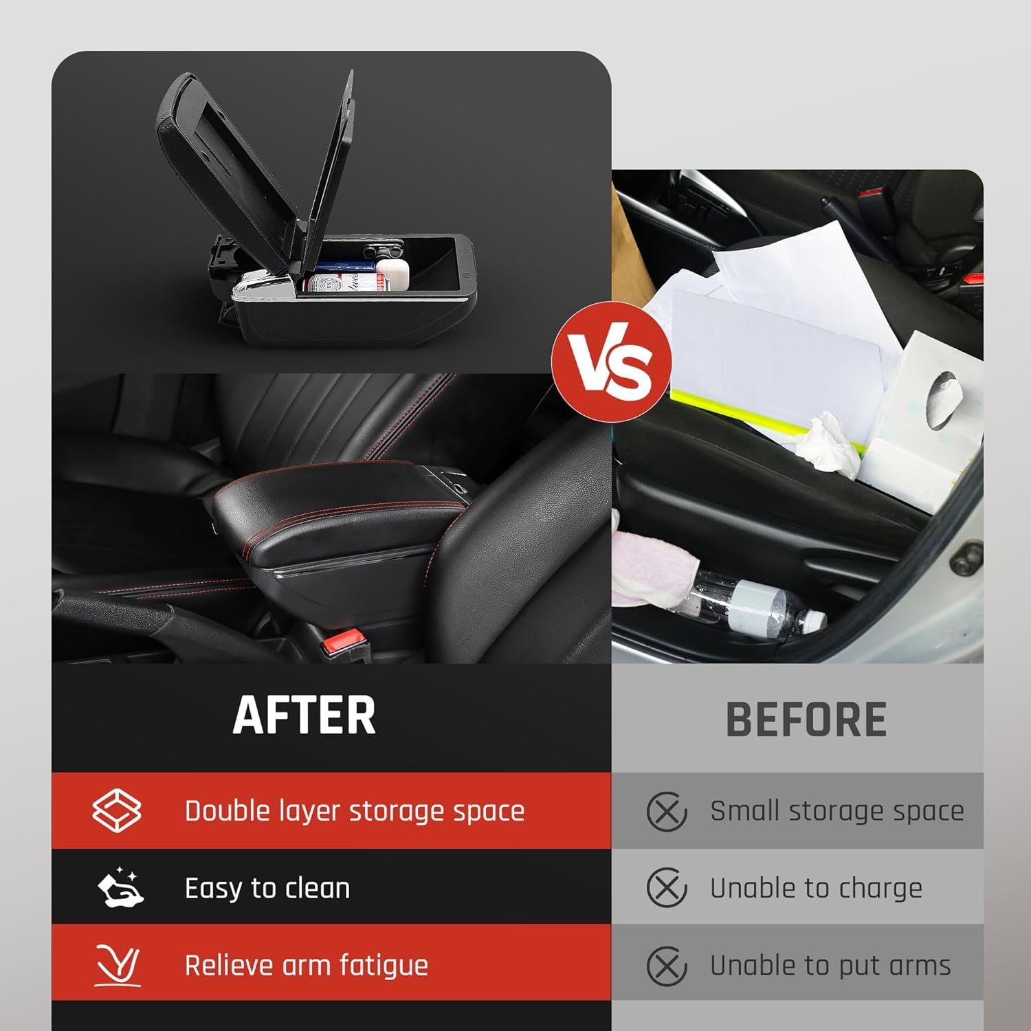 Tous les modèles qui posent problème peuvent contacter le magasin, qui vous proposera des produits spéciaux ! Il a passé avec succès les tests de protection de durabilité, ce qui en fait un produit robuste et durable. KAERGK Accoudoirs De Voiture Pour Citroen C1 Console Centrale Double Couche D'espace De Rangement Avec Porte-gobelets Facile à Assembler Cuir Confortable Et Durable Noir (Ligne Rouge Peu de temps, pas d'effort physique, peut être facilement réalisé par une seule personne Accoudoir Central Pour Peugeot C1/Citroën C1 - Avec Porte-Gobelets Et Ports USB - Double CoucheDescription Pour améliorer le confort de ta Peugeot C1 ou Citroën C1 ! Cet accoudoir se fixe sur la console centrale. En cuir PU et ABS, il a 7 ports USB (devant et derrière), des porte-gobelets, et la partie supérieure glisse de 5cm. Installation facile sans gêner le frein à main ou le levier... Le boîtier de l'accoudoir émet-il des cliquetis après l'installation ? Comment résoudre ce problème ? l'accoudoir s'adapte parfaitement aux trous de montage et est solidement fixé sans aucun problème d'oscillation ou de desserrage. YJYWZH Compatible avec Peugeot 301 Accoudoir Citroen C-Elysee Accoudoir Si vous devez placer des objets lourds vous pouvez utiliser la méthode de montage par vis, qui sera plus stable , convient à Citroen C1 Double couche, avec 7 ports USB (3 ports USB à l'avant, 4 ports USB à l'arrière), un câble de charge, la feuille supérieure de l'accoudoir peut glisser de 5 cm vers l'avant, vous offre plus de confort et de confort de conduite. Console Centrale Rangement Porte-gobelets Console Centrale Citroën C1 Accoudoir Voiture Citroën C1 2015-2022 - Double Rangement, Porte-gobelets Console Centrale Voiture Accessoire Auto Citroën C1 Le boîtier d'accoudoir convient-il à tous les modèles ? Comment puis-je confirmer la compatibilité ? Le boîtier de l'accoudoir est équipé de différentes bases de montage, et la forme du design varie en fonction du modèle et de l'année. install du boîtier de accoudoir aura-t-elle une incidence sur le fonctionnement du frein à main et du levier de vitesse L'accoudoir est conçu conformément à la console centrale d'origine de la voiture, l'espace d'utilisation est réservé et n'affecte pas le fonctionnement du levier de vitesse et du frein à main. Le matériau de surface du boîtier de l'accoudoir s'use-t-il ou se déforme-t-il après une utilisation prolongée ? Le boîtier de l'accoudoir est fabriqué en cuir PU haute densité et en plastique technique ABS haute résistance.
