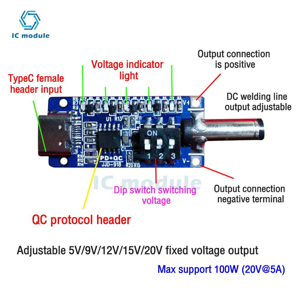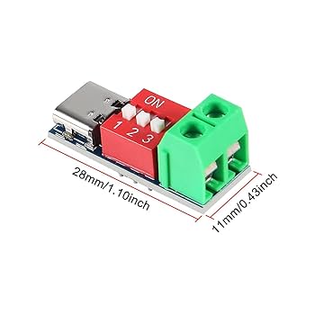 Réglage Facile par DIP Switch : Module sortie tension fixe configurez simplement la tension de sortie (jusqu’à 20V) à l’aide des interrupteurs DIP intégrés. Module de déclenchement de leurre de Charge rapide type-c PD QC AFC DC 5V 9V 12V 15V 20V sortie pour chargeur routeur WIFI haut-parleur intelligent caméra Son format miniature (31 x 20 x 5 mm) convient parfaitement aux projets électroniques embarqués, stations d’essai ou alimentations réglables. Le tableau de réglage est imprimé à l’arrière pour une utilisation rapide. Utilisation réservée aux utilisateurs expérimentés. Format Ultra Compact : Sa taille réduite de 31 x 20 x 5 mm et son poids léger de 2,9 g, module USB C 5V 9V 12V rendent idéal pour les montages électroniques, les tests d’équipements et les projets embarqués. Il est donc recommandé aux utilisateurs expérimentés qui savent gérer les risques liés à la haute tension USB. Mécanisme de déclenchement airsoft pour le fusil de sniper M24 Delta Déclenchement Intelligent : Ce n’est pas un convertisseur de tension mais un déclencheur de charge rapide qui communique avec l’alimentation pour fournir une tension supérieure à 5V selon les besoins. Attention : le module est un pont direct entre l’entrée et la sortie, il n’offre aucune protection contre les surtensions ou courts-circuits. Compatibilité Étendue : Ce Module de déclenchement PD/QC/AFC pour activer la charge rapide via des alimentations compatibles comme chargeurs USB C ou power banks modernes. Module trigger pour alimentation, compatible avec QC (Quick Charge), PD (Power Delivery) et AFC. ⚡ Le circuit n'est pas un transformateur de courant, il communique avec votre alimentation compatible (chargeur de téléphone rapide, etc...) pour déclencher la fonction charge rapide et donc une tension de sortie supérieure à 5V DC Modules Déclenchement Charge Rapide USB C Youmile 2 Pièces Module De Charge Rapide PD/QC/AFC/FCP Module De Déclenchement De Charge Rapide 5V 9V 12V 15V 20V Avec Commutateur à Cadran Tension Réglable Avec Câble USB Mâle à Deux Conducteurs Module Dip Switch 20V Le paquet comprend: 4 * QC/PD/AFC déclenchement de charge
