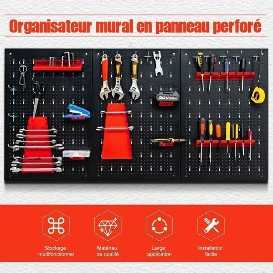 Utilisation polyvalente pour les bricoleurs, les artisans et les amateurs de bricolage Contenu de la livraison 3x murs à outils, Set de 25 supports Le panneau d'atelier stable en acier permet de disposer tes outils de manière individuelle, selon tes besoins. Les 25 supports et crochets en rouge vif et argent classique se distinguent bien de la plaque perforée. Système d'organisation pour votre atelier Montage mural facile avec le matériel de montage fourni Panneau perforé 685 x 420 x 23 | PPV12000 Panneau perforé avec 25 pièces Tu en as assez du chaos d'outils dans ton atelier, ton garage ou ta salle de loisirs ? Avec le panneau à trous pour outils en lot de 3, tu vas enfin mettre de l'ordre et de la clarté. Panneau à outils avec différents supports Pour les ateliers, les garages, les caves et les salles de loisirs Marque européenne à l'écoute des clients Rangé : mets de l'ordre dans ton environnement de travail avec le panneau à trous pour outils Capacité de charge : env., 25 kg , Matériau : acier Relaxdays Panneau perforé en métal, 25 pièces, Montage Mural, H x L x P : 60 x 118 x 2 cm, Noir et Rouge Dimensions de chaque élément mural H x L : env., 60 x 39 cm , Poids : env., 4,7 kg / individuel env., 1,6 kg Pour bricolage : tableau de travail comme aide au rangement pour ateliers, garages, caves, etc. Les 25 supports et crochets en rouge vif et argent classique se distinguent bien de la plaque perforée. Conception : panneau noir en acier avec crochets rouges... Large variété de produits Dimensions H x L x P : env., 60 x 117 x 2 cm Grâce au matériel de montage fourni, le montage mural est un jeu d'enfant. Matériel de montage mural inclus Rangement Mural Garage Crochets Relaxdays Panneau D'outils En 3 Pièces, Avec 17 Supports, Perforé De 60x39 Cm Hxl, En Métal, Noir-rouge Panneau Outillage Mural Fiabilité constante et engagement concret Conception : panneau noir en acier avec crochets rouges - Monter le panneau perforé sur le mur Relaxdays est une entreprise de e-Commerce au cœur de l'Europe spécialisée dans l'aménagement d'intérieur. 60x118x2 cm - Chaque partie du mur HLP env., 60x39x2 cm