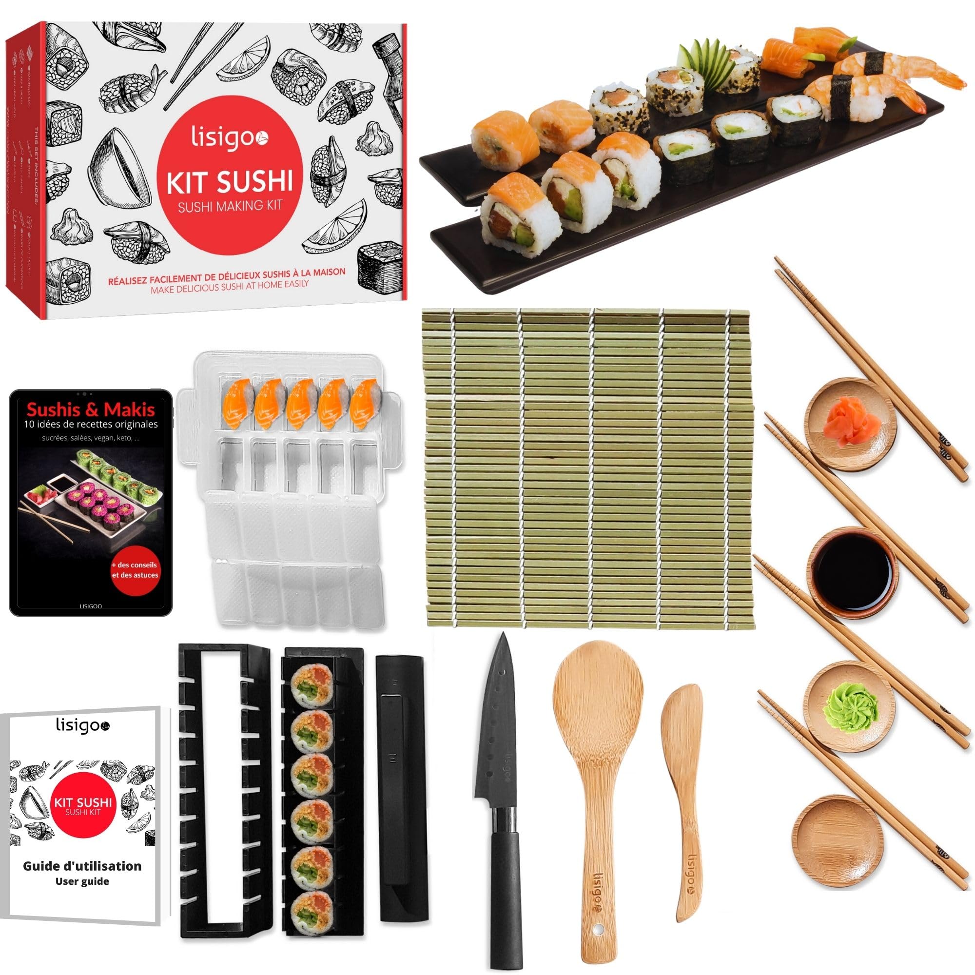 Rouleau à Sushi rapide/EASYSUSHI™ – Nour Parfait pour les soirées sushi entre amis ou pour diversifier vos repas quotidiens avec des mets japonais faits maison. Fabriquer Des Sushis Lisigoo Kit Sushi Complet - Sushi Maker - Appareil Pour Tapis Sushi Découvrez notre kit complet pour préparer des sushi et maki à la maison comme un véritable chef ! CONCEPTION PRATIQUE: Rouleau à sushi ergonomique avec mécanisme de compression pour des rouleaux uniformes et bien serrés USAGE FACILE: Système simple et intuitif permettant même aux débutants de réaliser des sushis comme un professionnel Sushi Maker | Le Japonais Kawaii Kit Sushi – Rouleau et Moule à Sushis Maison | Ustensile de chef Le matériau durable et la finition lisse facilitent le nettoyage après utilisation. MATÉRIAU DURABLE: Fabriqué en silicone alimentaire de haute qualité, résistant et facile à nettoyer Ce set pratique comprend un rouleau à sushi ergonomique en vert clair, un tapis de roulage texturé comme le bambou fabriqué en silicone pour plus de résistance aux lavages, et une spatule assortie pour une manipulation des ingrédients.