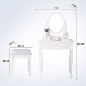 Construction robuste : grâce à sa construction robuste, cette coiffeuse avec éclairage et tiroirs est le choix idéal pour votre coin beauté. Les nombreuses étagères ouvertes offrent un espace de rangement suffisant pour exposer vos cosmétiques, vernis à ongles, etc. 【Design moderne et élégant】 Son apparence moderne et élégante s'intègre facilement à tous les styles de décoration. Cette coiffeuse offre beaucoup d'espace de rangement pour vos cosmétiques, bijoux, sèche-cheveux, fer à friser et autres accessoires de beauté, vous permettant de tout organiser et de tout avoir à portée de main. Vous disposerez d'un endroit plus confortable pour vous maquiller. Alliant charme et fonctionnalité, cette coiffeuse équipée d'un miroir LED apportera du cachet à votre chambre. Grâce à ses tiroirs en bois massif qui créent une illusion 3D et à son style contemporain, ce meuble fournira le rangement idéal pour vos produits de soin et de beauté Bureau de coiffeuse avec tabouret, coiffeuse de maquillage avec 1 à 2 tiroirs, coiffeuse avec miroir nuage, ensemble de coiffeuse avec finition blanche (couleur : blanc B, taille : 80 cm 【4 grand tiroir】La coiffeuse pour filles comprend 4 tiroir spacieux , offrant un espace de rangement suffisant pour vos produits de maquillage, vos produits de soin de la peau et autres articles essentiels, vous aidant à tout organiser et à tout retrouver facilement Le produit est livré avec des instructions d'installation détaillées et des pièces complètes pour faciliter l'assemblage de la coiffeuse blanche élégante 【Coiffeuse avec 3 modes de lumière colorée】Le miroir en forme de cœur et 3 options de couleurs lumineuses : la coiffeuse est équipée d'un grand miroir en forme de cœur, qui reflète votre apparence de manière plus claire et plus réaliste sous tous les angles. Il est équipé de 4 tiroirs, de 3 étagères ouvertes pour le rangement latéral, d'un large plateau et d'un tabouret rembourré. Bureau de coiffeuse avec miroir éclairé à LED, coiffeuse avec tiroir et tabouret rembourré, table de maquillage moderne avec miroir de luminosité réglable, pour chambre à coucher (couleur : blanc A, taille : 80 cm/31,4i Coiffeuse avec miroir led et tabouret Coiffeuse avec miroir led et tabouret : la sélection produits Leroy Merlin de ce mercredi au meilleur prix ! Retrouvez ci-après nos 459 offres, marques, références et promotions en stock prêtes à être livrées rapidement dans nos magasins les plus proches de chez vous Jolie Coiffeuse avec Miroir en Forme de Cœur Grand espace de rangement : la coiffeuse dispose de 4 tiroirs, vous permettant de ranger vos bijoux et vos produits de maquillage. 【Grande capacité de rangement】Les dimensions du meuble coiffeuse avec miroir sont de 80 × 40 × 135 cm (L × l × H) et son poids est de 24 kg. Petite Coiffeuse avec 4 Tiroirs et Tabouret. Ce banc est très facile à ranger et s'adapte parfaitement sous la table sans gêner lorsque vous ne l'utilisez pas. Les bandes lumineuses LED disposent de 3 modes de couleurs lumineuses, et la luminosité de chaque couleur peut être réglée