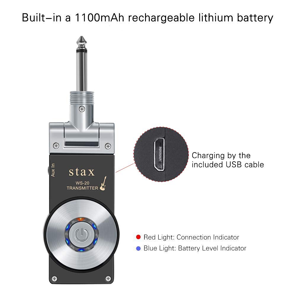 Contenu de l'emballage : 2 émetteurs sans fil pour guitare. Système de guitare sans fil 2,4 GHz Émetteur et récepteur rechargeable Portée de transmission de 30 m pour guitare électrique basse Transmission de signal sans fil non compressée 2,4 GHz, faible bruit et latence, portée effective d'environ 30 mètres Caractéristiques : * Installation sans effort : le système d'émetteur et de récepteur sans fil est conçu pour un fonctionnement rapide et facile, permettant aux musiciens de commencer à jouer sans configurations compliquées, améliorant ainsi la concentration sur leur musique. Transmission sonore claire : fonctionnant sur une bande de fréquence de 2,4 GHz, ce système offre une reproduction sonore impeccable avec une latence minimale, tout en conservant le son naturel de votre instrument pour les performances et les situations d'enregistrement. Installation et fonctionnement faciles : le design plug-and-play permet une connexion rapide entre vos instruments électriques et amplificateurs avec un minimum d'effort – insérez simplement l'émetteur dans l'entrée jack 6,35 mm de votre guitare et connectez le récepteur à votre amplificateur. 1 manuel d'utilisation (français non garanti). Système complet de guitare sans fil : comprend 2 émetteurs et 1 récepteur avec batteries au lithium intégrées rechargeables, vous donnant tout le nécessaire pour connecter deux guitares électriques ou instruments de basse simultanément sans enchevêtrer les câbles. Émetteur-récepteur sans fil E01-2G4M13S GHz 20mW nRF24L01 PA LNA 2.4... * Transmission audio claire : fonctionnant sur la fréquence de 2,4 GHz, ce système offre une reproduction sonore haute fidélité, un son clair même dans des environnements bruyants, ce qui le rend idéal pour les enregistrements en direct de gala et en studio. Éetteur et récepteur sans fil pour guitare nuérique 2,4 GHz Systèe Aeroband Guitar SYSTÈME DE GUITARE Sans Fil 2.4 éMetteur-RéCepteur De Guitare Sans Fil 24 émetteur Récepteur De 405085970969 Système Guitare Sans Fil 2.4GHz 1 récepteur de guitare sans fil., 2 câbles USB. * Distance de transmission généreuse : avec une portée fiable allant jusqu'à 30 mètres, les artistes peuvent profiter de la liberté de se déplacer sur scène tout en conservant un signal audio fort et ininterrompu. * Dimensions : 6 x 4,2 x 1,8 cm., Couleur : noir. * Réponse en fréquence : 20 Hz - 20 kHz. * Bande de transmission : 2,4 GHz ISM.