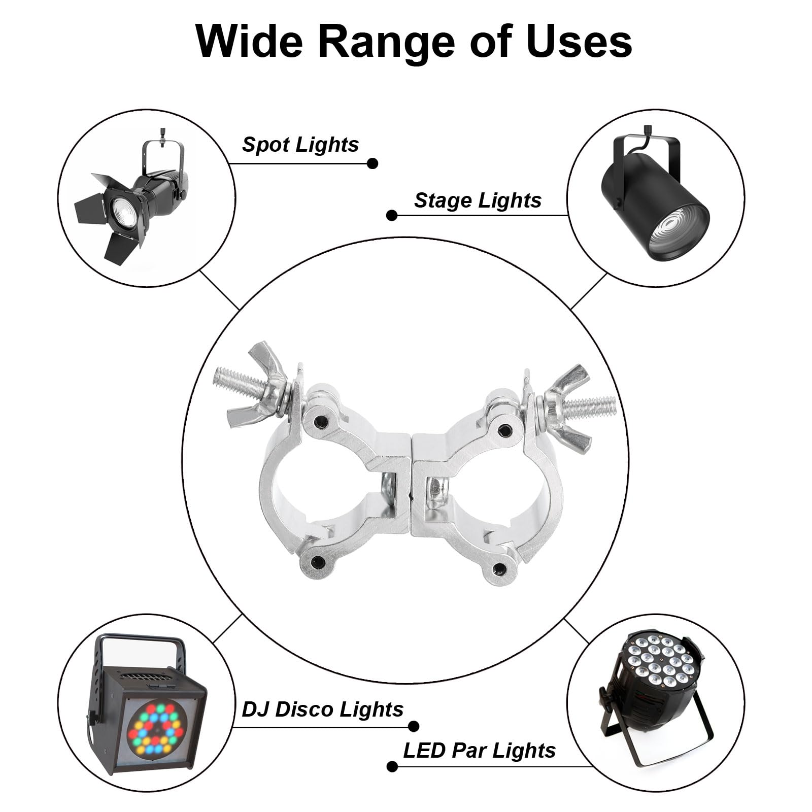 Ce que vous obtenez] - Le contenu de l'emballage comprend 1 pince de serrage double en alliage d'aluminium pour tuyau, avec des dimensions totales de 92 x 20 x 47 mm et une charge maximale de 4,54 kg [Matériau] - Nos colliers de serrage pour tuyaux d'éclairage sont en alliage d'aluminium, qui présente les caractéristiques d'une grande résistance, d'une résistance à la corrosion et d'une ductilité. Pince Aluminium Double Boucle Pince A Collier De Serrage QUARKZMAN Attache De Poutre Légère, Pince En Alliage D'Aluminium Pour Tuyau D'Éclairage De Scène De 24-26mm De Diamètre, Charge Maximale De 4,54 Kg, Couleur Noire, 1 Pièce Support éclairage Scène 18-21mm Description1., Matériau : Nos colliers de serrage pour tuyaux d'éclairage sont en alliage d'aluminium, qui présente les caractéristiques d'une grande résistance, d'une résistance à la corrosion et d'une ductilité. [Large application] - Ils conviennent aux projecteurs à faisceau mobile, aux projecteurs LED, aux effets lumineux LED et autres appareils d'éclairage, utilisables lors de spectacles, dans les bars, les pubs, les événements, les théâtres, les discothèques et autres occasions. [Facile à utiliser] - Dévissez les boulons filetés manuellement, enroulez-les autour du tube lumineux, puis serrez-les manuellement. Collier de serrage pour tuyau Akozon - modèle 6AN - en alliage d... Pince de poutre I Pince de levage de poutre 4400lbs 2ton Cintres de poutre robustes en noir [Ce que vous obtenez] - Le contenu de l'emballage comprend 1 pièce de pince de serrage double en alliage d'aluminium pour tuyau, avec des dimensions totales de 80 x 20 x 36mm et une charge maximale de 6,8 kg. De plus, l'alliage d'aluminium a une apparence argentée naturelle, esthétiquement plaisante. L'installation ou le démontage est rapide et facile, et il enveloppe complètement le tube de support pour augmenter la stabilité., 4., Remplacement parfait : Accessoires de remplacement parfaits pour votre produit endommagé.