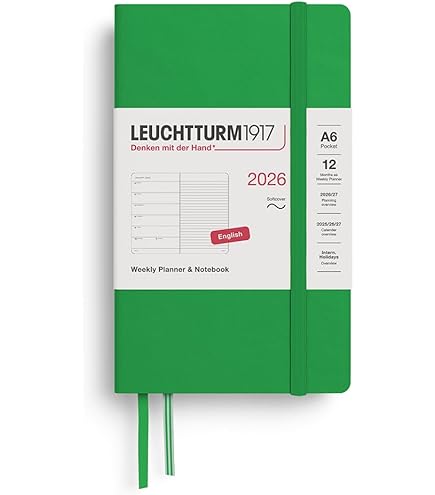 Agenda Semainier & Note Ligné 2026 LEUCHTTURM1917, Anglais - A6 - Hardcover - Dusty Rose Agenda Avec Pages Détachables Poche LEUCHTTURM1917 372754 Agenda Semainier 2026, Rose Carnet Planning Hebdomadaire B5 Avec fermeture élastique et 2 marque-pages, pochette pliable dans la couverture et étiquettes de titre et de dos pour écrire et archiver., Dimensions : 178 x 254 mm Les feuilles amovibles pour les notes ainsi que la poche de couverture complètent l'agenda hebdomadaire. Agenda semainier sur 12 mois (du 1er janvier 2026 au 31 décembre 2026) avec couverture rigide en anglais. Agenda semainier Flowers - 15x21cm - Rose - Janvier à décembre - OXFORD L'agenda hebdomadaire offre un aperçu parfait de tous les rendez-vous de la semaine sur une double page anglaise avec couverture rigide. L’agenda Semainier & Note Ligné 2026 de LEUCHTTURM1917, ici décliné en Rising Sun au format Composition (B5) avec couverture rigide (Hardcover), combine intelligemment planification hebdomadaire et prise de notes Avec un aperçu de 3 ans (2025, 2026, 2027), un planificateur de projet, quelques feuilles détachables pour les notes à l'arrière du calendrier, les phases de la lune et les jours fériés internationaux. Également disponible en tant qu'agenda semainier académique de 18 mois, à partir du mois de juillet.
