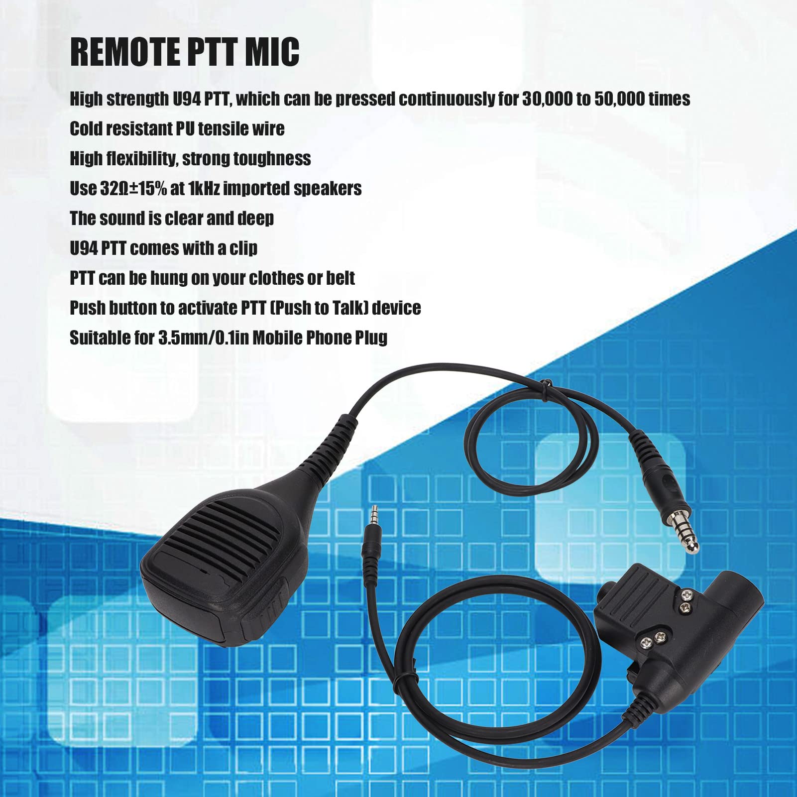 [Modèle compatible] Microphone d'épaule de 7,1 mm/0,28 pouces avec PTT, adapté pour GP338 GP-328 GP-340 GP-380 et autres talkies-walkies, bonne compatibilité. Micro Haut-parleur Bidirectionnel, Microphone D'épaule Modèles compatibles : microphone d'épaule 7,1 mm/0,28-i avec PTT, adapté pour GP338 GP-328 GP-340 GP-380 et autres talkies-walkies, avec une bonne compatibilité Spécification : Type d'élément : Microphone portatif Matériau : PU + PTT Couleur : Noir Spécifications du haut-parleur : Niveau de pression sonore : 108±3 dB à 1 kHz 1 mW Puissance nominale : 50 mW Puissance maximale : 2 W Impédance du haut-parleur : 32 Ω±15 % à 1 kHz Spécifications du microphone Sensibilité : -31±5dB à 1kHz 0dB=1V/0., 316G Impédance de sortie : 1 200 Ω±15 % à 1 kHz Application : convient pour GP338 GP-328 GP-340 GP-380 et autres talkies-walkies Liste des packages : 1 x U94 PTT 1 microphone à main Comment utiliser : Branchez et jouez. Caractéristiques du haut-parleur : le haut-parleur adopte 32 ± 15 % à 1 kHz, une puissance nominale de 50 mW et une puissance maximale de 2 W, vous offrant un son épais [Matériau de U94 PTT haute résistance, peut être pressé en continu 30 000 à 50 000 fois, fil de traction PU résistant au froid, haute flexibilité et ténacité. Fonctionnalité : 1., [Matériau de U94 PTT haute résistance, peut être pressé en continu de 30 000 à 50 000 fois, fil de traction en PU résistant au froid, haute flexibilité et ténacité., 2., [Haut-parleurs puissants] Microphones radio bidirectionnels, importés 32 Ω ± 15 % à un haut-parleur de 1 kHz, 108 ± 3 dB à un niveau de pression acoustique de 1 kHz de 1 mW, une puissance maximale de 2 W, un son fort et épais., 3., [Portable] Ce U94 PTT est livré avec un clip, qui peut être accroché à vos vêtements ou à votre ceinture, il est très portable, le bouton active l'appareil PTT (Push to Talk), plug and play., 4., [Modèle compatible] Microphone d'épaule de 7,1 mm/0,28 pouces avec PTT, adapté au GP338 GP‑328 GP‑340 GP‑380 et autres talkies-walkies, bonne compatibilité., 5., [Conception ergonomique] Microphone d'épaule pour haut-parleur talkie-walkie professionnel, finition soignée, design ergonomique, compact et facile à utiliser, agréable au toucher. U94 PTT Pour GP338 GP328 QID-micro PTT à Distance Microphone D'épaule De 3,5 Mm Microphone De Avec PTT U94 Push To Talk