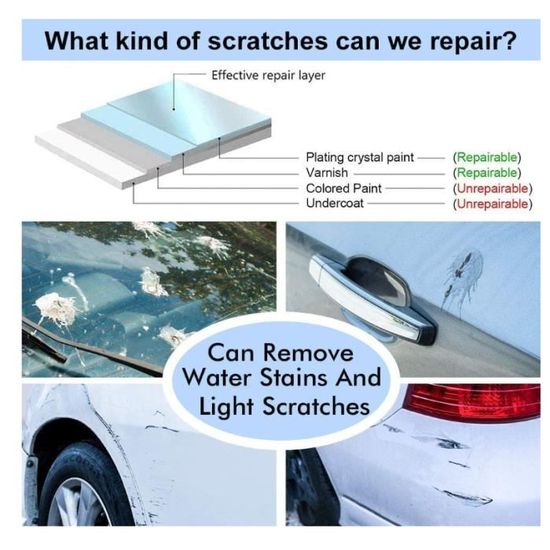 Composition Avancée: Ce chiffon de polissage pour voiture intègre des abrasifs, des polis, des lubrifiants et des minéraux efficaces pour éliminer les rayures légères et redonner à la peinture de votre voiture son éclat d'origine. Cette solution innovante associe la puissance des microfibres, de la poudre métallique et de l’huile minérale pour offrir un nettoyage en profondeur qui revitalise la peinture et les surfaces de votre voiture Découvrez le pouvoir du Chiffon Nano Sparkle pour Voiture, votre solution tout-en-un pour maintenir votre véhicule en parfait état. Polyvalence et Efficacité: Outre la réparation des éraflures, notre chiffon Nano Sparkle est conçu pour retirer les excréments d'oiseaux, les traces d'oxydation, l'asphalte et la rouille, rendant votre voiture impeccable en quelques minutes seulement. Adaptabilité Universelle: Que votre véhicule soit une petite citadine ou un grand SUV, et quelle que soit sa couleur, de noir à rose, notre chiffon de polissage est conçu pour s'adapter à tous les types et couleurs de véhicules. Utilisation Facile et Rapide: Pour une efficacité maximale, nettoyez et séchez la surface avant utilisation. Une fois les rayures et la saleté éliminées, un simple nettoyage de la surface permet de finaliser le processus, laissant votre voiture avec une finition impeccable. Nano Sparkle Chiffon original pour rayures de voiture Avec le Chiffon Nano Sparkle pour Voiture, vous avez la garantie d'un produit performant qui rendra votre voiture éclatante de propreté et de brillance. Ce pack de quatre chiffons est spécialement conçu pour éliminer les rayures légères et restaurer la brillance originale de la peinture de votre voiture. Pour garantir la longévité de votre chiffon, suivez les conseils d'entretien fournis : ne pas laver le chiffon, éviter de l'utiliser s'il est contaminé par la terre ou le sable, et le conserver dans un sac scellé après chaque utilisation. Lot de 4 Nano Sparkle Cloth,Chiffon Nano Voiture,Nano Sparkle Cloth... Chiffon Multifonction Voiture 4PCS Chiffon Nano Sparkle Pour Voiture, Chiffon Polissage Anti Rayure Voiture Carrosserie Ce produit est idéal pour tous les propriétaires de voiture qui cherchent une solution rapide et efficace pour entretenir l'apparence de leur véhicule sans recourir à des services professionnels coûteux.