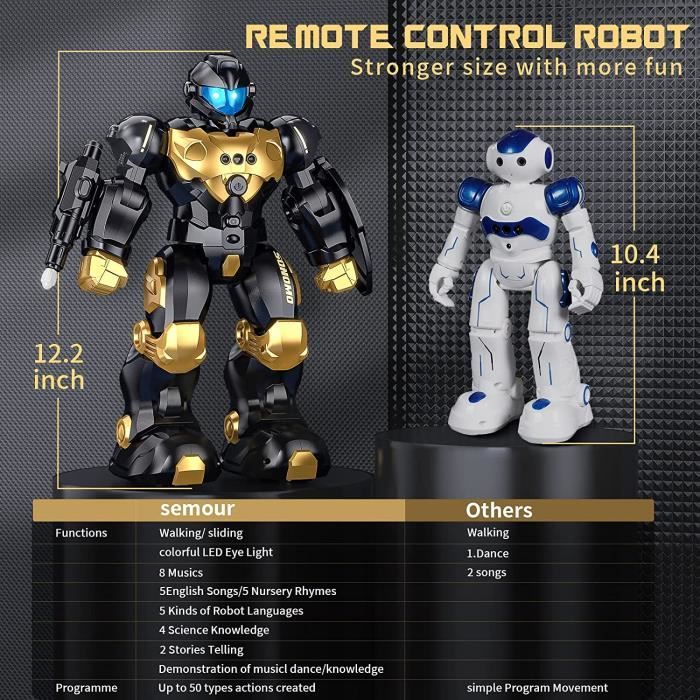 Codage pour les enfants avec des figures de danse en un clic : ce robot télécommandé programmable enseigne les compétences de base en codage grâce à sa mémoire de 20 commandes, aidant les enfants à apprendre le séquençage et la logique Codage pour les enfants avec des figures de danse en un clic : ce robot télécommandé programmable enseigne les compétences de base en codage grâce à sa mémoire de 20 commandes, aidant les enfants à apprendre le séquençage et la logique. Robot RC Rechargeable USB Robot RC Pour Enfants Avec Programmation Intelligente, Contrôleur Infrarouge, Danse, Chant, Marche Lunaire, Yeux LED Et Détection 1 - Jeux - Jouets Robot Danseur LED Enregistrement Description du produit Programmation de robots jouets RC pour enfants, robots télécommandéé pour garçons et filles de 3 ans et plus, avec démonstration automatique, danse, musique, yeux LED et fonction d'enregistrement Avertissement De Sûreté Toy inside., Adult supervision recommended Robot RC rechargeable avec une longue autonomie : profitez de jusqu'à 2 heures de jeu avec ce robot rechargeable, qui se recharge complètement en seulement 1 heure via USB. Télécommande sûre, adaptée aux enfants et stable : fabriqué à partir de matériaux durables et sans danger pour les enfants, ce robot jouet pour enfants comprend un contrôle du volume à trois niveaux (fort/faible/silencieux) pour s'adapter à tous les environnements. Robots à programmer, programmation Le robot va devenir le meilleur ami de votre enfant. Dotés d'une intelligence artificielle qui leur permet d'interagir avec les enfants, les meilleurs jouets robots sont à retrouver chez JouéClub, en ligne ou en magasin Robot Jouets pour enfants, Jouets télécommandés Haiti Profitez d'une musique entraînante ou passez en mode silencieux pour un effet veilleuse. Avec le mode danse en un clic, le robot exécute des mouvements amusants et préprogrammés pour impressionner les amis et la famille. La télécommande du robot permet de contrôler indépendamment la jambe gauche et la jambe droite afin que les enfants puissent créer des mouvements personnalisés, ce qui encourage la créativité et le développement de la motricité.