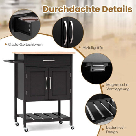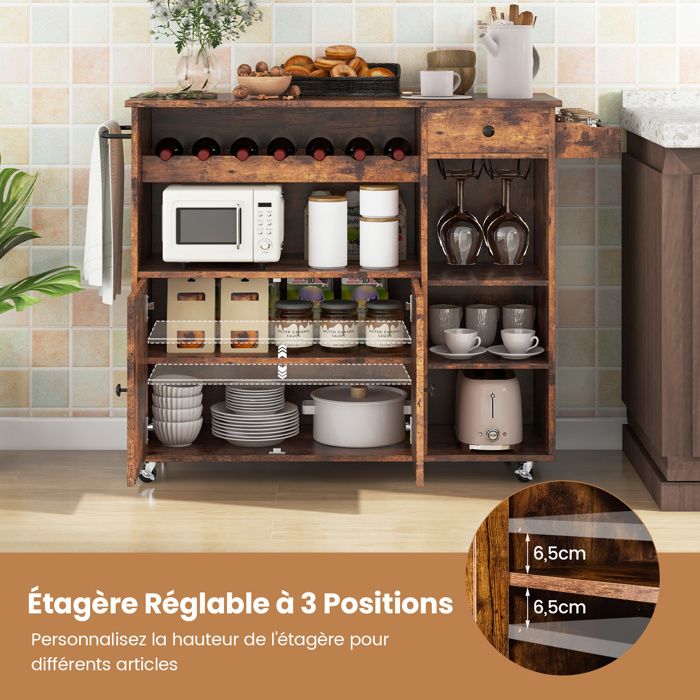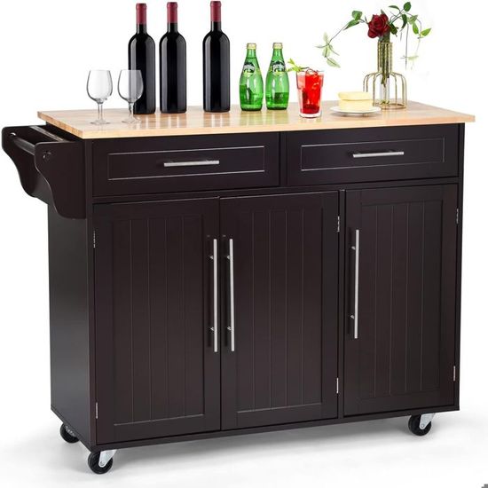 Capacité de charge de chaque étagère : 20 kg. Le plan de travail spacieux de l'îlot de cuisine mobile est fabriqué en bois de caoutchouc de qualité supérieure et peut être utilisé aussi bien comme plan de travail que pour poser les aliments, créant une atmosphère chaleureuse. Spécifications: Grand plan de travail (100 cm x 50 cm) est fabriqué en bois d'hévéa avec un grain élégant. Son design simple s'adapte à de nombreux styles de décoration, aussi bien pour un usage quotidien que pour recevoir des invités. Les poignées latérales facilitent la manœuvre et servent en même temps de porte-serviettes. Etagere Plan De Travail Cuisine Chariot De Cuisine Avec Plan De Travail Et 2 Paniers De Rangement îlot De Cuisine Mobile Avec Tiroir Le grain de bois naturel et élégant donne à ce chariot de cuisine une touche de luxe, alliant fonctionnalité et décoration. Adaptable à différents environnements - En plus de l'utiliser comme chariot de cuisine, il peut également être utilisé pour servir des aliments dans la salle à manger, comme étagère à collations dans le salon ou comme table à thé sur le balcon. Informations sur le produit : Couleur : noir + naturel, blanc + naturel Matériau : bois d'hévéa + panneau MDF Dimensions (L x l x H) : 106 x 50 x 89 cm. Mobile à volonté - Le chariot de rangement est équipé de 4 roulettes pivotantes (dont 2 avec frein) qui permettent une rotation et une fixation flexibles. L'étagère inférieure offre un espace supplémentaire pour ranger la vaisselle tandis que le porte-serviettes pratique offre un accès rapide pour une cuisson sans... Description du produit : Le design ouvert à 3 niveaux de ce chariot de cuisine offre beaucoup d'espace de rangement et permet de garder les ustensiles de cuisine, les épices et autres objets à portée de main. Capacité de charge du plan de travail : 50 kg. En outre, le tiroir est équipé d'une poignée en métal qui peut être ouverte et fermée en douceur, ce qui rend l'utilisation plus confortable. L'espace de rangement ouvert à 3 niveaux offre suffisamment d'espace pour ranger des objets du quotidien La structure principale est en pin massif La barre latérale peut être utilisée comme porte-serviettes ou poignée pour se déplacer. Nombreuses zones de rangement : notre chariot de cuisine dispose d'un tiroir supérieur, d'un plateau ouvert et d'une partie spacieuse avec porte pour offrir suffisamment d'espace pour les ustensiles, les aliments, les épices et les pots Giantex Chariot de cuisine à roulettes portable avec plateau Espace de rangement spacieux : ce chariot de cuisine dispose de 3 niveaux avec espace de rangement ouvert, idéal pour organiser les ustensiles de cuisine, les bouteilles d'épices, les ustensiles de cuisine et d'autres objets du quotidien.
