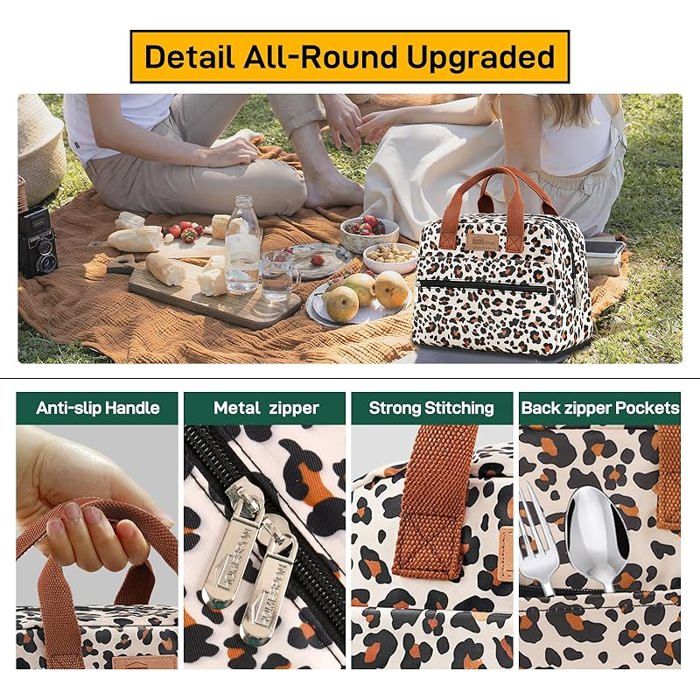 【Design À La Mode】 Ce Produit A Un Design À La Mode. Avertissement De Sûreté No Ce joli sac fourre-tout imprimé léopard peut être utilisé comme sac à déjeuner, sac de pique-nique, sac de courses divers, récipient de rangement pour femmes, hommes, enseignants, etc Contenu : vous recevrez un sac isotherme en tissu Oxford avec motif léopard de 29 x 17 x 23 cm et un sac en tissu noir pour ranger les couverts de 6,5 x 20 cm pour répondre à vos besoins quotidiens Le Sac À Lunch Imprimé Léopard Et Le Sac À Couverts Beige Sont À La Fois Beaux Et Pratiques. ALAZA Sacs à Déjeuner Pour Femmes, Filles, Garçons, Motif Léopard Le Design Du Sac Fourre-Tout Est Facile À Transporter Et Adapté À Diverses Occasions. Large Application : Convient Non Seulement Pour Un Usage Personnel Quotidien, Mais Également Comme Solution De Vaisselle Portable Pour Les Étudiants Et Les Employés De Bureau. Sac Déjeuner Bureau école Pique-nique Sac Isotherme Léopard Sac à Déjeuner Isotherme Motif Léopard - 29x17x23cm - Avec Sac à Couverts Sac Pique-nique Anti-fuite Sac Pratique Travail école Pique-nique La Taille Du Sac À Couverts Est De 20, 5 X 5, 3 Cm Et La Couleur Est Beige, Adaptée À La Vaisselle Portable Et Au Déjeuner. Description du produit Fonctionnalités Détaillées Sac À Main Imprimé Léopard Matériel: Tissu Taille: 22*16*15Cm Couleur : Imprimé Léopard. Quantité : 1 Pièce Sac À Couverts Matériel: Toile Taille: 20, 5*5, 3 Cm Couleur : Beige Quantité : 1 Pièce Caractéristiques 1., Ce Produit Est Fait De Tissu Et De Toile Durables Et Convient À Une Utilisation À Long Terme., 2., Design Élé Et Utilisation Pratique, Adapté À Diverses Occasions Et Activités.