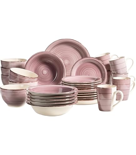 CreaTable, 22234 Série Fashion Service de table 16 pièces en grès, passe au lave-vaisselle et au micro-ondes, production de qualité Vaisselle Vintage Fait Main CreaTable, 22851, Série Country, Ensemble De Vaisselle Vaisselle Et Arts De La Table grès de haute qualité Handmade also means that the plates can be different in shape, glaze and colouring. Découvrez notre service de table en grès haut de gamme, incluant : - 6 x assiettes de dîner 27 cm - 6 x assiettes à dessert 19,5 cm - 6 x mugs 30 cl - 6 x bols multifonctions 18 cm. Creatable , , Série CRIMSON, Ensemble 30 pièces - 19428 - Maison Arborant un décor Handmade avec spirale peinte à la main et liseré terracotta, chaque pièce est unique par sa forme, son émail et ses couleurs. Collections compl tes Le service de vaisselle moderne Bonita de 24 pi ces au design spirale se compose de 6 assiettes plates, 6 assiettes dessert, 6 assiettes creuses ( 32OZ ras bord ) et 6 bols polyvalents (24OZ ras bord Un choix judicieux pour rester à la pointe de la mode cette année !, Production de qualité A good purchase decision in the trend of this year!