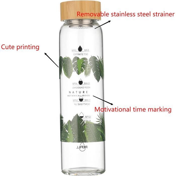 Découvrez notre gamme de bouteilles en verre de 1 litre. Parfaites pour conserver le lait, les jus de fruits et autres boissons artisanales, celles-ci allient transparence, durabilité et écologie Nettoyage facile : la bouteille est facile à nettoyer et peut être lavée à la main et au lave-vaisselle. Bouteille Verre Borosilicate Motivation à Boire Bouteille En Verre Borosilicate Avec Indication Du Temps 1l Gourde Hermetique En Verre Avec Couvercle En Bambou 1 Litre Reutilisable Avec Couvercle En Silicone Olive Carafe D'eau Verre borosilicate de qualité supérieure : notre bouteille d'eau de 1 litre est fabriquée en verre borosilicate durable et résistant à la chaleur. Parfait pour les amateurs de thé et les amateurs d'eau : avec sa grande capacité de 1000 ml, la bouteille offre suffisamment d'espace pour vos boissons préférées. Particulièrement adaptée pour le thé, l'eau, l'eau infusée ou d'autres boissons de votre choix. Caractéristiques : Grâce à l'échelle de motivation, la bouteille d'eau de 1 litre indique si vous avez bu suffisamment d'eau en une journée. Il suffit de le remplir deux fois pour atteindre l'objectif de 2 litres Bouteille Verre Borosilicate 1l Que ce soit pour boire directement ou pour profiter lentement, cette bouteille s'adapte à vos préférences. Le design sans coins difficiles d'accès assure une utilisation hygiénique - Idéal pour un usage quotidien. Idéal pour les boissons chaudes et froides sans compromettre le goût ou la qualité.