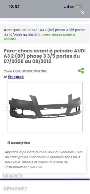 PARE CHOC AVANT DESIGN AUDI A3 8P 05-08 LOOK RS3 - A PEINDRE Sans Pdc Lave Phare Avec Feux Anti Brouillard Cal Noir 4052355325891 Pare-choc avant à peindre avec trous lave-phares Audi A3 et A3 Sportback 2008-2012 RA30904 Vendu et expédié par Repiauto Avant - A peindre avec couche d'apprêt Référence OEM : 8P0807105KGRU · Année de construction : 07/2008 - 08/2012 · Avant · Avec emplacement pour 4 radars de stationnement et lave-phares · A peindre avec... Pièce Carrosserie Compatible A3 3 Et 5 Portes Phase 3 Pare-choc Avant à Peindre Avec Trous Lave-ohares Skoda Fabia 3 Phase 2 Pare-choc Lave-phares à Peindre Avec emplacement pour lave-phares - Pour 3 et 5 portes