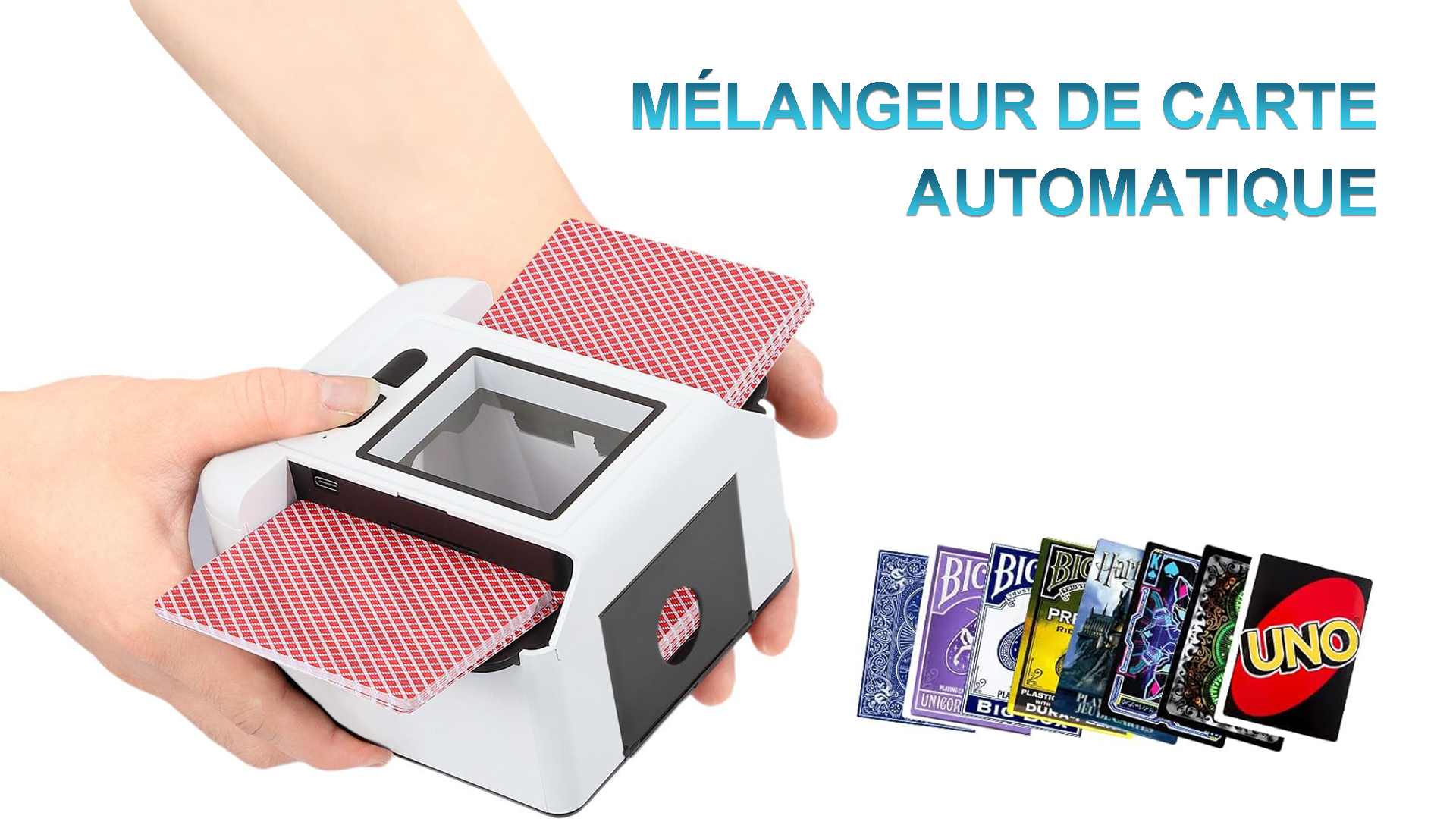 Rechargeable et Portable: Ce mélangeur de cartes est équipé d'une batterie longue durée de 2000 mAh qui se recharge rapidement via USB-C. Mélangeur de Cartes Automatique pour 1 à 2 Ponts, Mélangeur électrique avec Modes Automatique et Manuel en Une Seule Pression, mélangeur de Cartes Rechargeable pour Poker, UNO, Blackjack, Skip-BO Description du produit Mélange Automatique à un Seul Bouton: Plus rapide, plus silencieux, plus intelligent : la fonction AUTO intégrée détecte automatiquement vos cartes et les mélange parfaitement en seulement 2 secondes. Plus besoin de changer de batterie. Compact et Portable: Notre mélangeur de cartes est léger et portable, et peut être utilisé partout à la maison, en voyage, en camping ou en club. Jusqu'à 2 000 mélanges peuvent être effectués avec une seule charge de batterie, idéal pour les tournois et les longues soirées de jeu. Prend en charge 1 à 2 jeu simultanément et assure un mélange homogène et fluide à chaque fois. Ce mélangeur de cartes électrique est le cadeau idéal pour tous les amateurs de jeux de cartes qui apprécient la praticité et la qualité. Parfait pour les cartes de poker standard, le blackjack, le bridge, le Texas Hold'em et bien d'autres, il est idéal pour tous les types de jeux. Pas besoin de les tenir, pas de blocage : commencez à jouer. Compatibilité étendue avec Divers Jeux de Cartes: Grâce à ses lames rétractables, ce mélangeur de cartes s'adapte à différentes tailles de cartes. Mélangeur de Cartes Professionnel Mélangeur Cartes Poker Mélangeur De Cartes Automatique Rechargeable 2000mAh, Mélangeur Mélangeur 2 Jeux Cartes Batterie 2000mAh Le capteur intelligent intégré détecte précisément les cartes et s'arrête automatiquement après le mélange, garantissant une préparation de jeu fluide et sans délai.