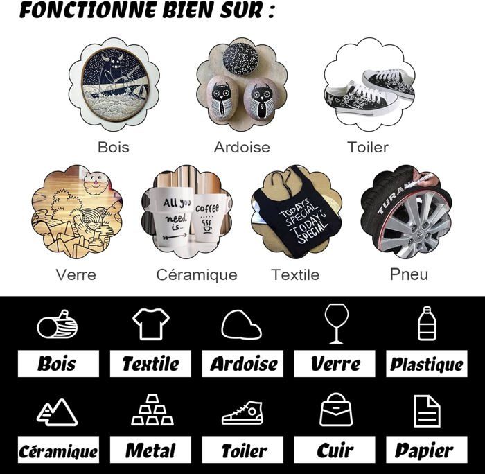 Leur encre indélébile et permanente garantit des résultats durables sur de nombreuses surfaces. Cet ensemble portable de quatre marqueurs–deux blancs et deux noirs – vous permet de réaliser des dessins, des coloriages et des créations artistiques avec une précision remarquable. Après application, laissez sécher l'encre avant d'ajouter une deuxième couche pour une finition encore plus nette et homogène. Après avoir appliqué l'encre, laissez sécher avant d'ajouter une deuxième couche si nécessaire pour un effet encore plus marqué et durable, offrant ainsi une finition professionnelle et uniforme. Les couleurs opaques des marqueurs permettent de recouvrir efficacement les surfaces et de créer des effets contrastés. Edding Marqueur permanent 2200 C - Noir - 1 stylo - Pointe biseautée 1-5 mm - Séchage rapide - Résistant à l'eau et aux essuyages - Pour carton, plastique, bois, métal - Marqueur universel Pointe de 4 mm pour des Lignes Précises et Détaillées: La pointe de 4mm de ces marqueurs permet de réaliser des lignes nettes et précises, idéales pour des travaux de dessin minutieux, du coloriage complexe ou des illustrations délicates. Que ce soit pour des projets artistiques professionnels ou des créations personnelles, ces marqueurs offrent un contrôle optimal pour chaque détail. Marqueur Feutre Craie liquide - Blanc - Pointe 2 - 6 mm - Indélébile... Marqueurs Permanents NICETY Lot De 60 Stylos Noirs Indélébile à Feutre Stylo Peinture Encre Pigmentée à Base d'Eau pour une Large Gamme d'Applications: Les marqueurs sont dotés d'une encre pigmentée à base d'eau, ce qui les rend idéaux pour des projets d'art et d'artisanat variés. Grâce à la pointe de 4 mm, ces marqueurs offrent un excellent contrôle lors du travail, de l'illustration, de l'annotation ou de la décoration. Les marqueurs permanents, ou marqueurs indélébiles, sont parfois demandés dans la liste des fournitures scolaires et des fournitures du bureau pour écrire sur des surfaces épaisses, comme du carton Vous pouvez les utiliser sur métal, verre, plastique, textile, pierre, céramique, et bien d'autres encore, ce qui en fait des instruments parfaits pour des projets créatifs à la maison, au bureau ou dans un cadre professionnel. Ces marqueurs sont parfaits pour réaliser des dessins, des coloriages détaillés ou des annotations qui résistent au temps. Les marqueurs sont des outils indispensables pour les amateurs d'art et les professionnels de la décoration. Lot Pratique de 4 Marqueurs Noir et Blanc: Ce pack comprend quatre marqueurs , deux blancs et deux noirs, vous offrant une palette de base idéale pour une multitude de projets créatifs.