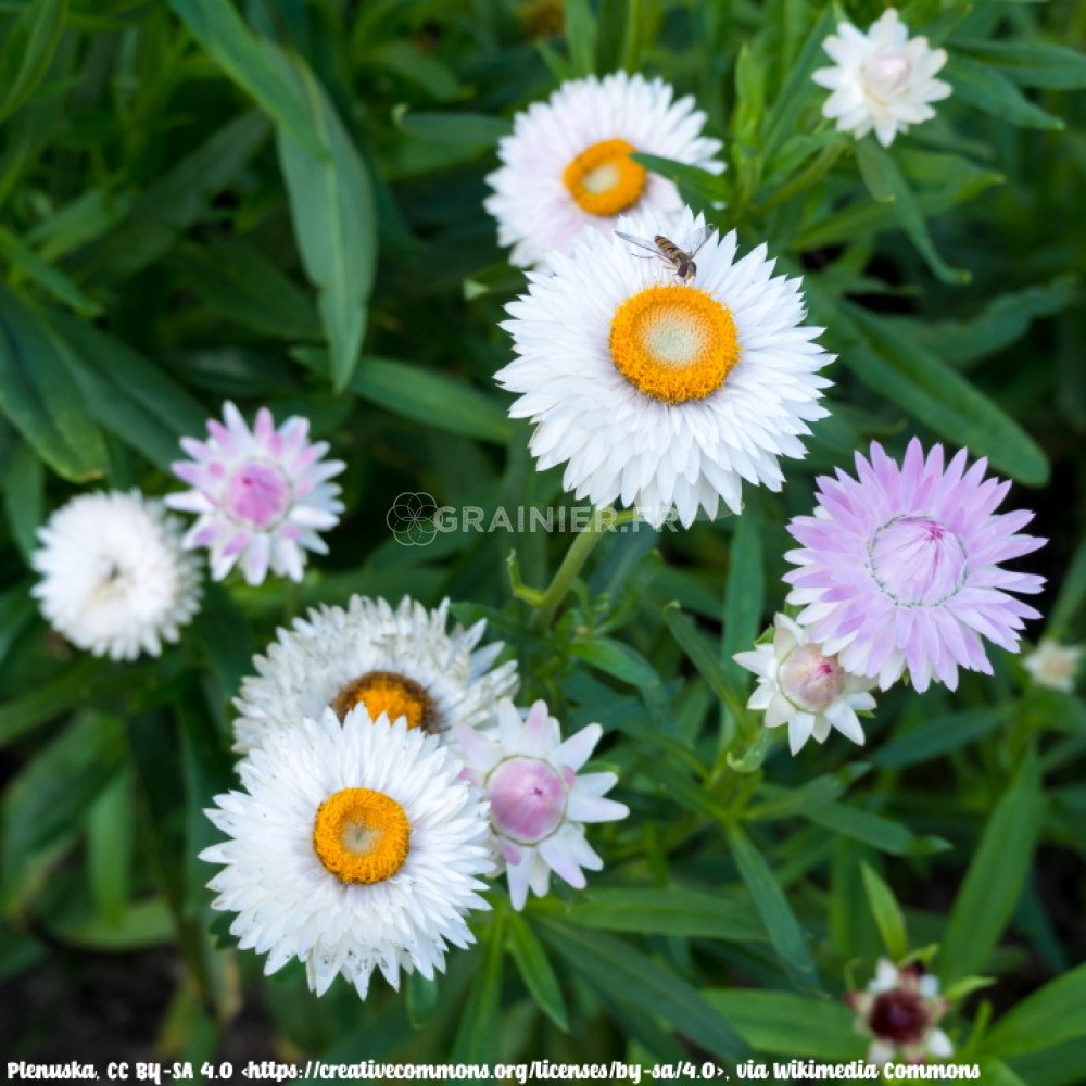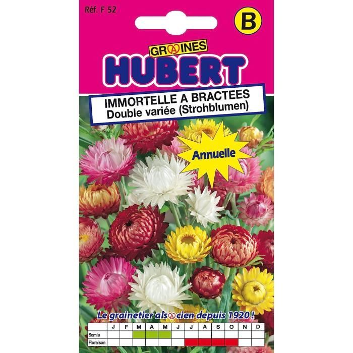 Jardinière : De juillet à octobre Plante annuelle hauteur 120 cm avec de nombreuses couleurs vives, c'est la reine des fleurs pour bouquets secs Utilisation : Surtout comme des fleurs coupées séchées Plante Annuelle 120cm Graines De Fleurs D' Double Variée Immortelle à Bractées Semillas Batlle Immortelle A BRACTEES Produit neuf Délai de livraison: En stock 2,36 € Livraison gratuite Voir l'offre L'immortelle à bractées est une plante annuelle aux fleurs de papier, avec lesquelles ont confectionne des bouquets de fleurs séchées Graines d'immortelles à bractées Moreska - Helichrysum bracteatum le sachet de 1200 graines environ (1g) - Gamm vert