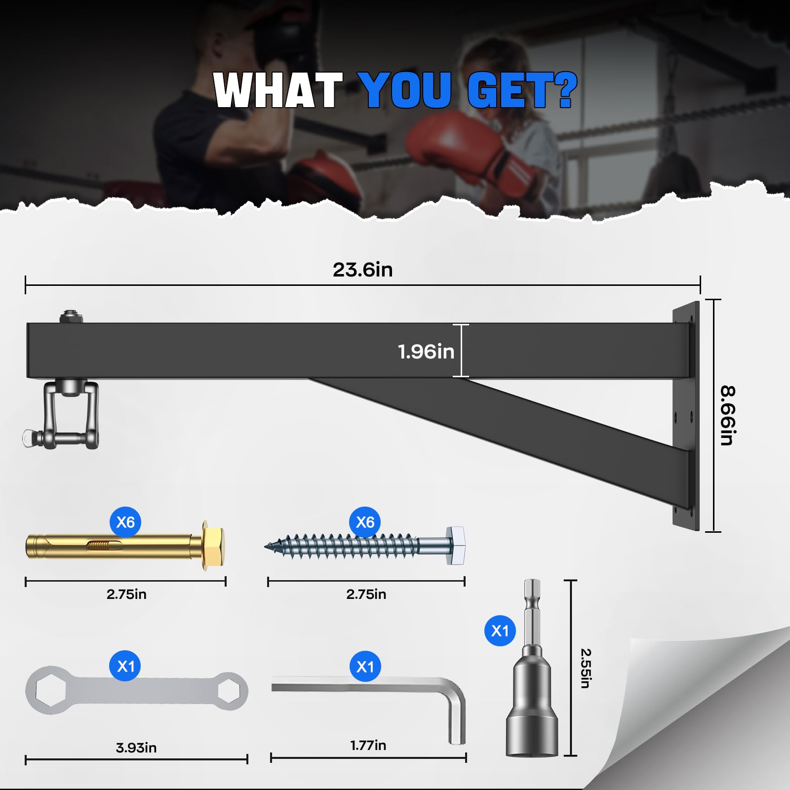 Remarque : nous vous recommandons d'utiliser un foret de 10 mm pour les travaux de perçage., (Foret non inclus) Support de sac de frappe facile à installer : vous recevrez 1 support solide pour sac de frappe avec 12 vis. Compatible avec tous types de sacs de frappe, sacs de sable, sacs de kickboxing. Le crochet permet une rotation à 360° sans bruit quand il n'est pas serré trop fort POTENCE SAC DE FRAPPE SUR PIED - FIGHT Parfait pour tout support de sac de frappe lourd : que vous souhaitiez pratiquer la boxe, le MMA, le Muay Thai ou tout autre art martial, ce support mural pour sac de frappe peut supporter n'importe quel sac de frappe lourd jusqu'à 400 kg. POTENCE SAC DE FRAPPE SUR PIED - FIGHT Remarque : pour obtenir une rotation silencieuse à 360 ° du crochet, vous n'avez pas besoin de serrer la vis hexagonale très fermement lors du montage pour obtenir cet effet. (Lors du montage du crochet, les rondelles fournies sont utilisées sur les vis hexagonales, donc vous n'avez plus à vous soucier de la desserrage des écrous. Potence Sac Boxe Lourd 400kg IMAYCC Nouveau Support Sac De Frappe, Lourd Potence Sac De Sac De Frappe Sur Pied Tous les outils de montage nécessaires sont inclus, de sorte que la fixation sur les murs en bois ou en béton est facilement possible. Support mural durable et résistant à la rouille : ces supports muraux pour sac de frappe sont fabriqués en acier ultra résistant. Ils sont construits avec des entretoises diagonales renforcées et plus larges qui peuvent supporter jusqu'à 400 kg.