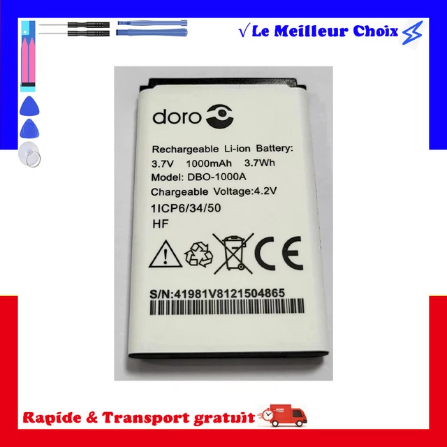 Remplacement pour la batterie de votre téléphone Batterie de rechange pour téléphone portable, smartphone, appareil multimédia | Rechargeable | Chaque cellule de batterie est testée Batterie performante | Capacité : 1200 mAh | Tension : 3,7 Volt | Énergie : 4,44 Wh | Type : Lithium-ion SHAWOROCE Batterie 1000 mAh 3,7 V compatible avec téléphone portable Doro 1370 1372 1880 2404 2820 2880 5860 6040 6060 6820 6880 7439 Phone Easy DBO-1000A DFB-0210 DFC-048 0 piles Li-ion DBAA-1000A Conforme aux normes légales | Finition de haute qualité | Utilisation durable Achetez Batterie vhbw Compatible avec Doro 6041, 6060, 7001H, 6821, 6880, 6881, 6060 ECO, 6061, 7000H, 6820 Téléphone portable Smartphone (1000mAh, 3.7V, Li-ion). Lun des nombreux articles disponibles dans notre rayon {1} ici chez Batterie Doro 6880 Vhbw Batterie Remplacement Pour Doro DBX-1350A Pour Smartphone Senior (1200mAh, 3,7V, Li-ION Batterie Telephone Les batteries Li-Ion sont utilisées dans les appareils mobiles à forte consommation d'énergie tels que les smartphones, les ordinateurs portables, les appareils photo, les outils électriques. Ces batteries sont également utilisées dans le modélisme RC et le photovoltaïque