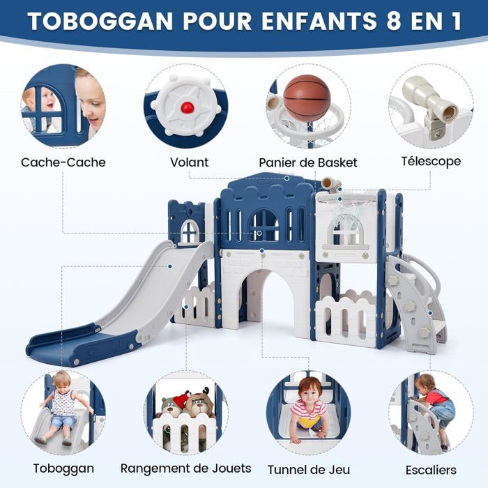 En grimpant, en glissant, en lançant et en explorant, les enfants peuvent non seulement développer leur motricité, mais aussi leur imagination. Ensemble de jeux pour enfants 11 en 1, avec un toboggan, une balançoire, un tunnel en arche, un EN STOCK : Toboggan pour enfants 8 en 1, 2 toboggans, escalade, perçable, avec panier de basket, convient pour l'intérieur et l'extérieur, toboggan de jardin, PEHD, blanc cassé, 9331813081056 pas cher. Livraison rapide partout en France Montage rapide et entretien facile : Les modules s'assemblent rapidement grâce aux instructions fournies. Construction Solide et Sûre : Fabriqué en plastique HDPE haute qualité avec structure renforcée et surfaces ultra-lisses pour une durabilité exceptionnelle et une glisse confortable, garantissant une sécurité totale pendant le jeu. Découvrez notre test détaillé du toboggan 8 en 1 Hominewti : une solution idéale pour offrir des moments d'aventure et de jeu captivants aux tout-petits Toutes les surfaces se nettoient facilement avec un chiffon humide, pour un entretien minimal. Toboggan multifonctionnel 8 en 1 pour enfants : Cet ensemble de jeu tout-en-un comprend une structure d'escalade, un toboggan, un télescope et un panier de basket avec rangement intégré pour ballons et jouets, pour des jeux variés et un divertissement sans fin. Avec Panier Basket Télescope TMISHION Toboggan Pour Enfants Ensemble De Balançoire Pour Tout-petits Toboggan Interieur Enfant