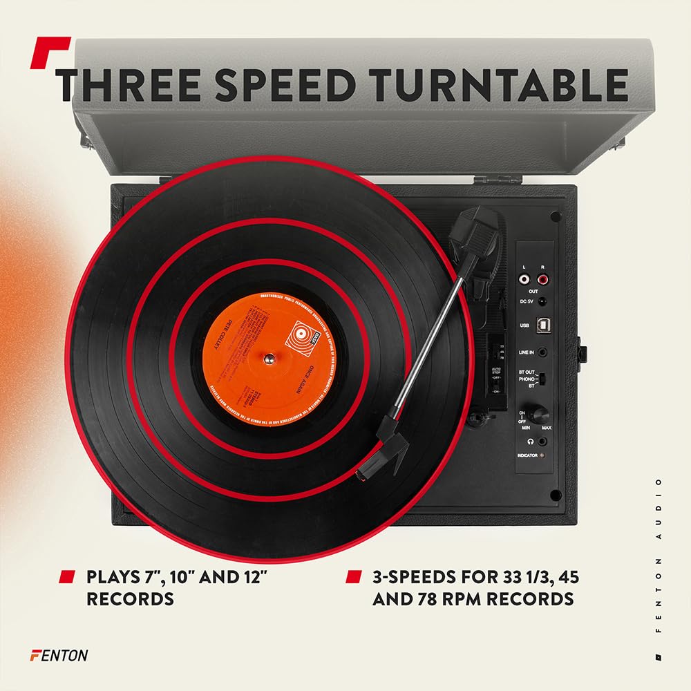 Avec émetteur Bluetooth : Cette platine vinyle dispose de la fonction émetteur Bluetooth afin de diffuser votre musique ou vos disques sur des enceintes Bluetooth ou sur un casque audio Bluetooth ! Profitez d'un son stéréo avec ces haut-parleurs intégrés. Enregistrement du vinyle via USB: Cette fonctionnalité permet d'enregistrer vos vinyles en fichier MP3 via USB. Platine vinyle Fenton RP118B Platine Vinyle Bluetooth avec Haut Vous pourrez donc ensuite réécouter vos musiques sur votre téléphone ou autres appareils. Fenton RP162W Platine Vinyle Bluetooth avec Haut-Parleurs Intégrés - Blanc Fenton RP115F Platine Vinyle Vintage avec Valise de Rangement - Marron, fonctionnalité Bluetooth, Tourne Disque avec Haut-parleurs intégrés, pour disques 33, 45 et 78 Tours, Facile à Transporter - Rangement vinyle Détails du produit ; Vitesses · Fonctions · Équipement ; 33 1/3 tours/min, 45 tours/min, 78 tours/min · Bluetooth, Arrêt automatique, Numérisation vinyles · Haut...