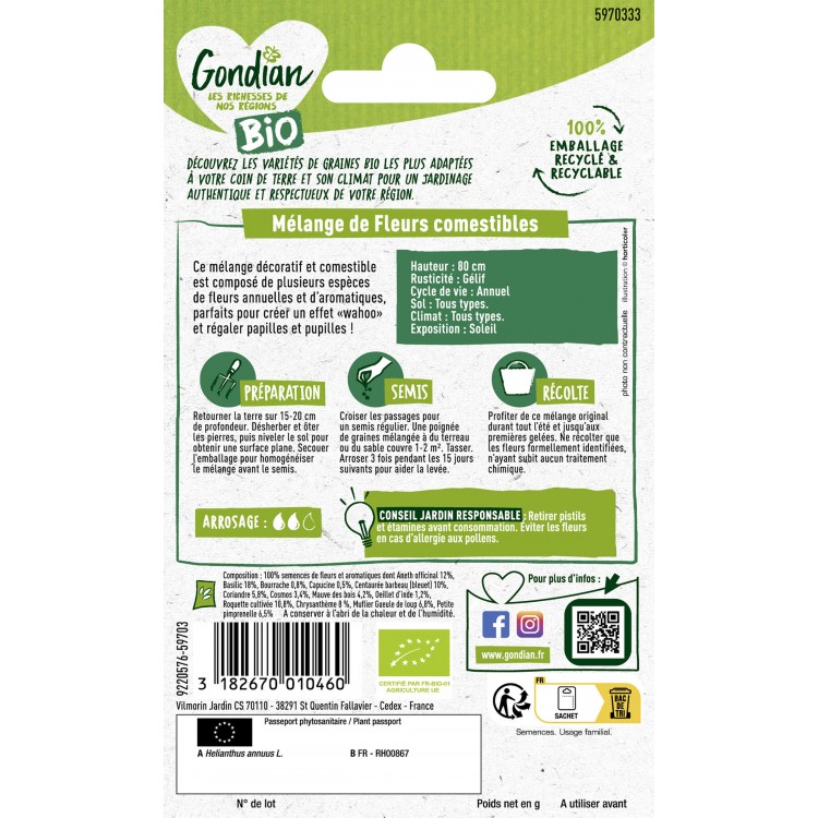 Fleurs COMESTIBLES en mélange 🌱 Livraison Gratuite Pour préserver la qualité de vos fleurs comestibles, nous recommandons de les conserver dans leur emballage d'origine dans un endroit frais et sec. Dessin De Fleurs Mix De Semillas De Flores Comestibles Ingrédient Gastronomique Fleuri Découvrez notre délicieux mélange de fleurs comestibles de 25g, parfait pour agrémenter vos créations culinaires avec une touche florale unique. COMPOSITION: Assortiment de 20 pièces de Griffes de Lion (Martynia Annua) soigneusement sélectionnées pour leur qualité DIMENSIONS: Emballage compact de 12 cm x 4 cm x 20 cm, facilitant le stockage et la conservation Le mélange de fleurs comestibles se compose de capucine, souci, bleuet, bourrache, oeillet d'Inde et chrysanthème. Ce mélange attire les plus curieux et est un bel atout pour décorer vos plats Fleurs en melange comestibles bio ETS | Bricomarché L'ensemble est présenté dans un emballage compact de 12 x 4 x 20 centimètres, garantissant une conservation optimale de vos fleurs. CONTENU: Mélange de fleurs comestibles séchées de 25g, parfait pour agrémenter vos plats et créer des présentations culinaires élégantes Ce mélange soigneusement sélectionné comprend 20 pièces de Griffes de Lion (Martynia Annua), offrant une expérience gustative originale et une présentation visuelle spectaculaire.