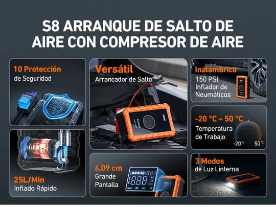 【Appareil multifonction】Ce booster batterie voiture intègre plusieurs fonctions : démarreur de batterie, gonfleur pneus voiture, power bank et lampe d’urgence. Il intègre une lumière LED haute intensité avec trois modes : lumière fixe, clignotante et SOS. Remarque : La batterie doit être chargée à plus de 50 % pour pouvoir démarrer le moteur. Fundada en 2000, el fundador, como piloto veterano, ha tado profundamente arraigado en los campos de aplicación IoT, sistemas de comunicación al aire libre, diseño de circuitos integrados, sensor, el software del dispositivo y el R & D del hardware, y los algoritmos por más de 20 años Le capteur haute précision arrête automatiquement le gonflage lorsque la pression préréglée est atteinte, évitant ainsi tout surgonflage 【Démarrage puissant de 4000A】Le courant de pointe de 4000A peut facilement démarrer des véhicules 12V à essence (jusqu'à 9,0L) et diesel (jusqu'à 8,0L), y compris les motos, voitures, SUV, quads, fourgonnettes, camions et tondeuses à gazon. Les pinces intelligentes garantissent une connexion sûre, sans étincelles ni erreurs, pour que même les débutants puissent l’utiliser en toute confiance. ASMAX Arrancador de Baterias de Coche 4000A, Compresor de Aire 150PSI, Arrancador de Coche 12V para 9L de Gasolina o 8L de Diésel, Booster con Pantalla LCD Grande, para Camión/Moto - T20 Visita la tienda de ASMAX 3,7 (44 Idéal pour voitures, SUV, motos, camionnettes, bateaux et plus encore. Le T20 est équipé d’un système de sécurité intelligent avec 10 niveaux de protection, offrant une défense totale à chaque démarrage. Le Démarreur Voiture T20 se recharge complètement en 3 à 4 heures et offre une autonomie d’utilisation de 20 à 30 minutes, idéal pour les déplacements en plein air sans souci 【10 niveaux de protection de sécurité】Ce Démarreur Voiture est équipé d’un système intelligent de sécurité offrant dix types de protection : contre les étincelles, l’inversion de polarité, les courts-circuits, les surcharges, surtensions, surintensités, températures élevées et basses, surcharge et charge inverse. 【Gonfleur pneus voiture 150 PSI】Gonflage rapide avec un débit de 28L/min, capable d’augmenter la pression d’un pneu de 28 PSI à 36 PSI en seulement 1 minute. 1 Véhicules Compatibles 2 Situations Applicables 3 Climats Extrêmes Avec un courant maximal de 4000A, il démarre des moteurs à essence jusqu’à 9,0L et des moteurs diesel jusqu’à 8,0L en quelques secondes. JF.EGWO Arrancador de Coches, 3000A 26800mAh 150PSI Arrancador de Pas Seulement la Puissance, Aussi la Sécurité !, Compact, facile à utiliser et performant, le T20 est votre compagnon idéal pour les voyages, les excursions et les aventures sur la route. 【Arrêt automatique】Écran LED haute définition affichant en temps réel la pression des pneus avec une précision de ±0,01 BAR. Plage de température de fonctionnement : -20℃ à 45℃. Démarreur Batterie 4000A Arrancador De Batería Con Compror De Aire1750A 12 V Inflador De Neumáticos Digital De 150 PSI, Motor De Gasolina De Hasta 7,5 L Y Diésel De 5,0 L, Pantalla LCD Visible Cargador Gonfleur Pneus Voiture Le voyant rouge clignotant indique que la batterie est faible., Rechargez-la rapidement ! Gonflage rapide (28 L/min) avec 5 modes prédéfinis : ballons, vélo, moto, voiture et personnalisé (2-150 PSI). Les pinces intelligentes garantissent une connexion sûre, sans étincelles ni erreurs, facile à utiliser même pour les débutants